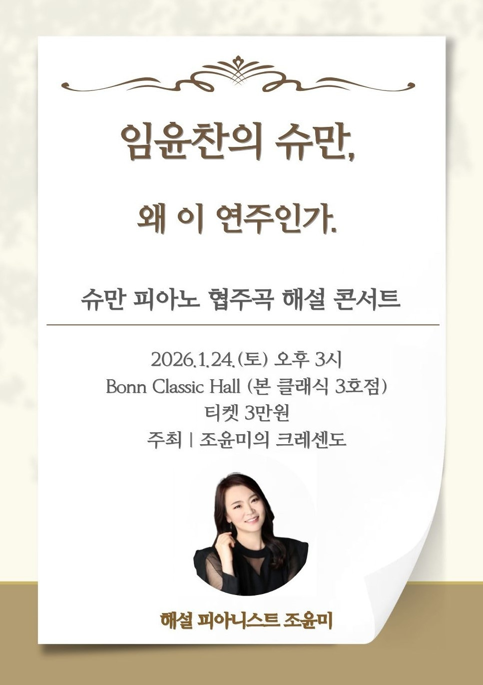 ‘슈만 피아노 협주곡을 라이브로 연주와 함께 생생한 해설을 해주셔서 감동의 순간이었습니다. 특히 마지막 서비스로 해주신 슈만 Op.16, N.1은 슈만의 정서가 적나라게 드러나는 처음 경험하는 느낌이었습니다. 이런 귀한 연주 마련해 주셔서 진심 감사드려요.’