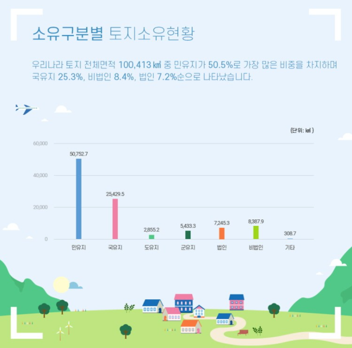 그림은 우리나라 국토의 소유구분별 토지소유 현황이다. 개인들이 제일 많이 가지고 있고, 그리고 국유지가 그다음으로 순으로 많다. 크게 보자면 민유지, 국공유지, 그리고 비법인·법인 순으로 나타난다.