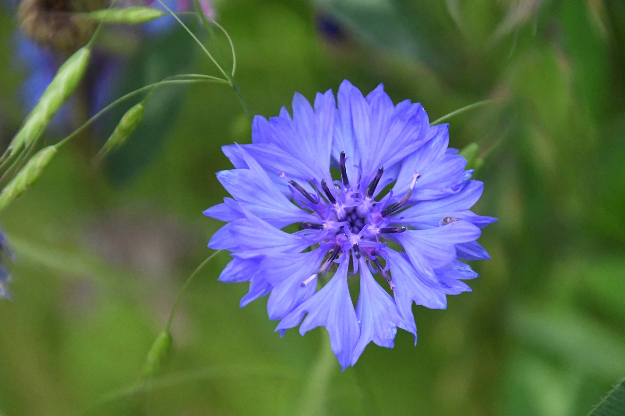 우리나라 풀 가운데 ‘쪽’은 푸른 물감을 만들 때 씁니다. 그래서 푸른 가을 하늘을 쪽빛 하늘이라고 합니다. 서양 꽃 가운데에도 푸른 물감을 만들 때 사용하는 꽃이 있습니다. 국화과에 속하는데 꽃의 모양이 마치 수레바퀴처럼 생겨서 수레국화라고 부릅니다. 원래 유럽 원산의 수입 원예종 꽃으로 요즈음 주변에 있는 공원에 집단으로 파종하여 꽃을 피워 파란색 꽃물결로 관람객을 유혹하기도 합니다. 꽃에 국화라는 이름이 들어 있지만 보통 여름에 많이 핍니다.