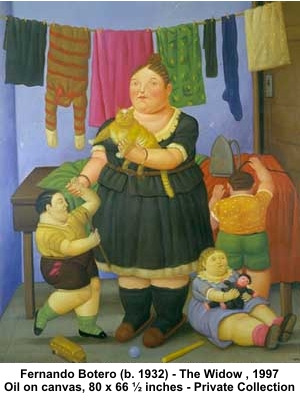1997년에 그린 <과부(The Widow)>도 그의 화풍에서 크게 벗어나지 않습니다. 보테로가 어렸을 때 그의 어머니는 과부가 되었고, 세 자녀를 궁핍한 살림에 어렵게 키웠다고 합니다. 이 그림에서 어머니의 표정은 비교적 담담하게 그려져 있는 것처럼 보이지만, 자세히 들여다보면 세 아이 사이에서 혼자 눈물을 흘리고 있는 과부의 모습에서는 숙연한 연민의 정이 피어오릅니다. 아마도 화가 자신의 어릴 적 어머니 모습을 그린 것이라서 그런 것이 아닐까 하고 생각합니다. 그런데 이 그림에서 등장하는 어머니나 아이들의 모습은 여전히 뚱뚱하기만 합니다.