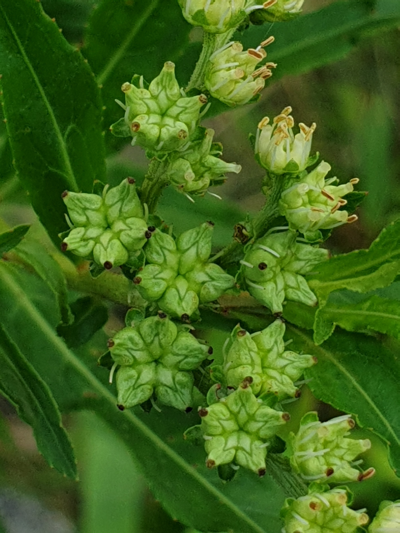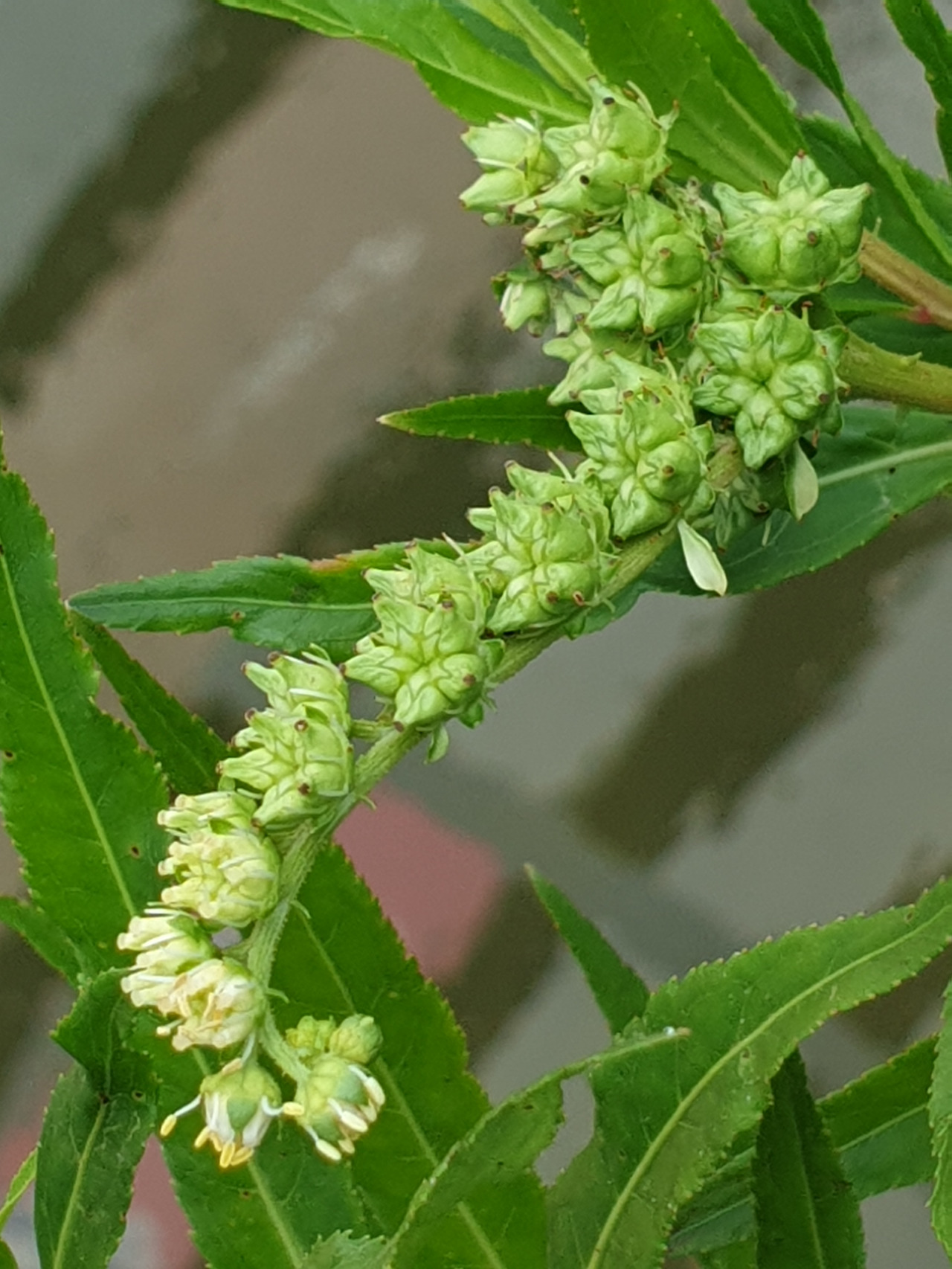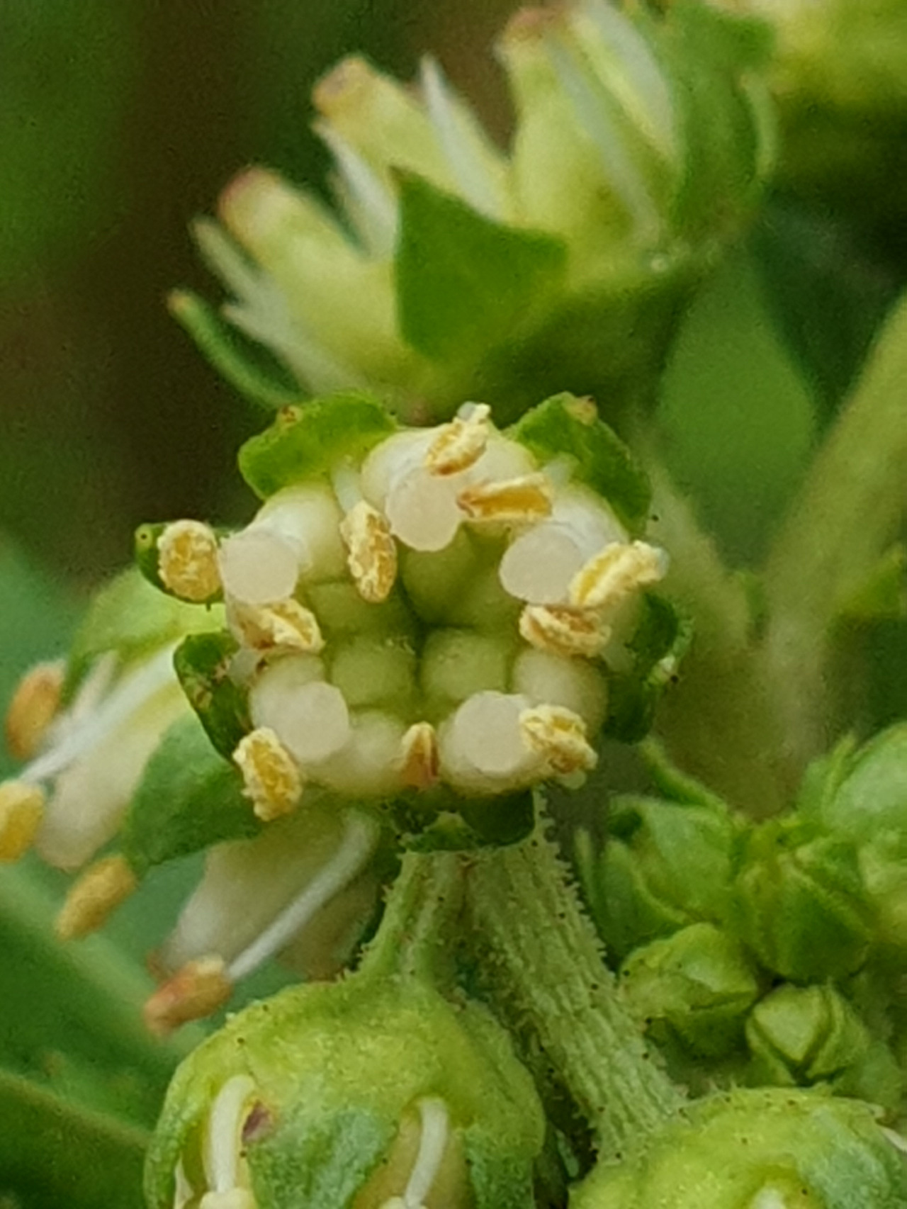 이 꽃의 학명은 Penthorum인데 그리스어의 '다섯(5)'를 뜻하는 pente와 '특징'이라는 뜻의 horos의 합성어로서 꽃 부분이 꽃받침은 종 모양이며 끝이 5개로 갈라지고, 꽃잎은 없고 10개의 수술은 꽃받침 밖으로 솟으며 심피는 5개로서 중부까지 합쳐지고 암술대는 5개로 짧으므로 꽃 부분이 5개로 되어있어서 붙여진 이름이라고 해요. 이 꽃은 숫자 5와 밀접한 연관이 있습니다.