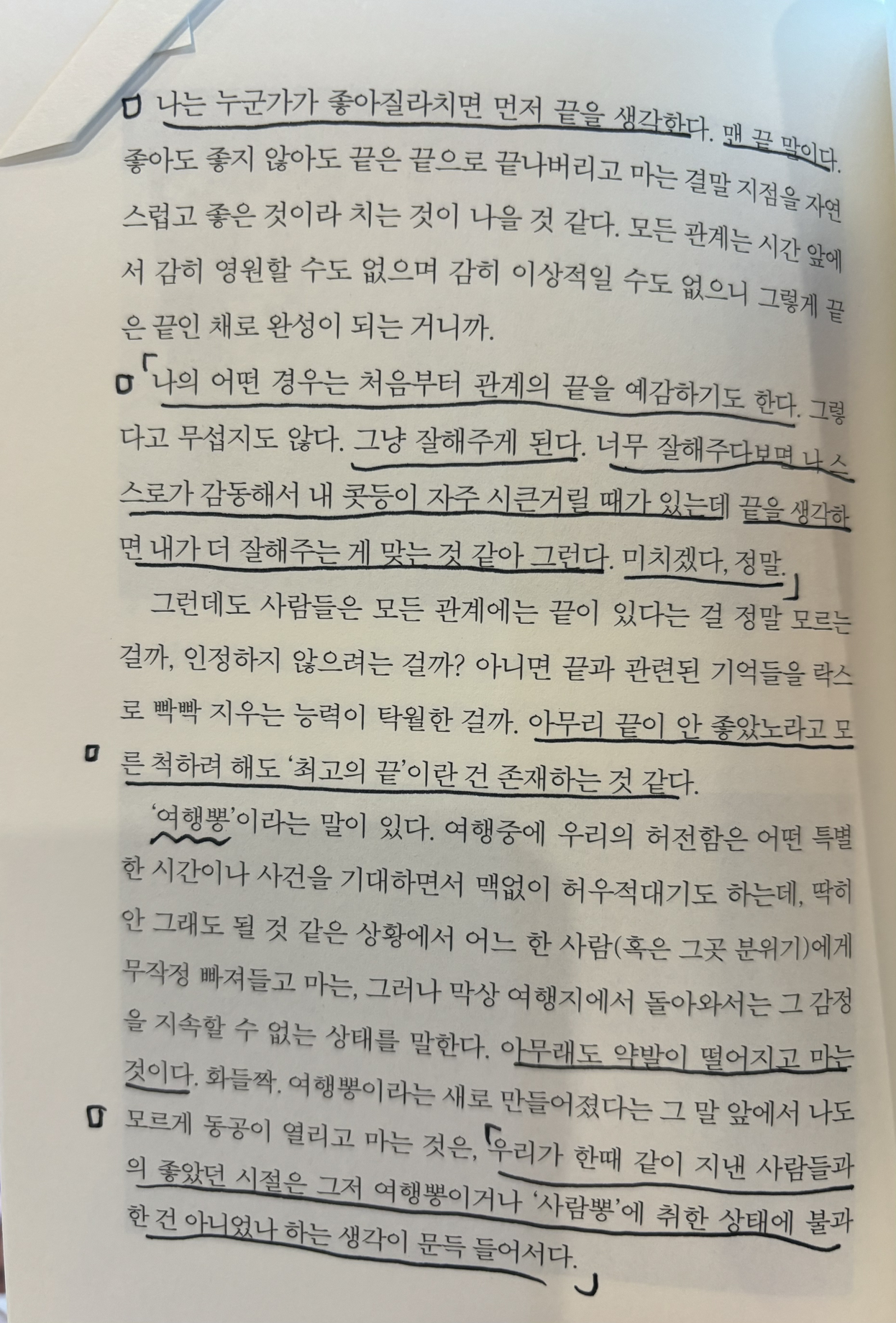 3. 나는 누군가가 좋아질라치면 먼저 끝을 생각한다. 맨 끝 말이다. 나의 어떤 경우는 처음부터 관계의 끝을 예감하기도 한다. 아무리 끝이 안 좋았노라고 모른 척하려 해도 ‘최고의 끝’이란 건 존재하는 것 같다. 우리가 한 때 같이 지낸 사람들과의 좋았던 시절은 그저 여행뽕이거나 사랑뽕에 취한 상태에 불과한 건 아니었나 하는 생각이 문득 들어서다.