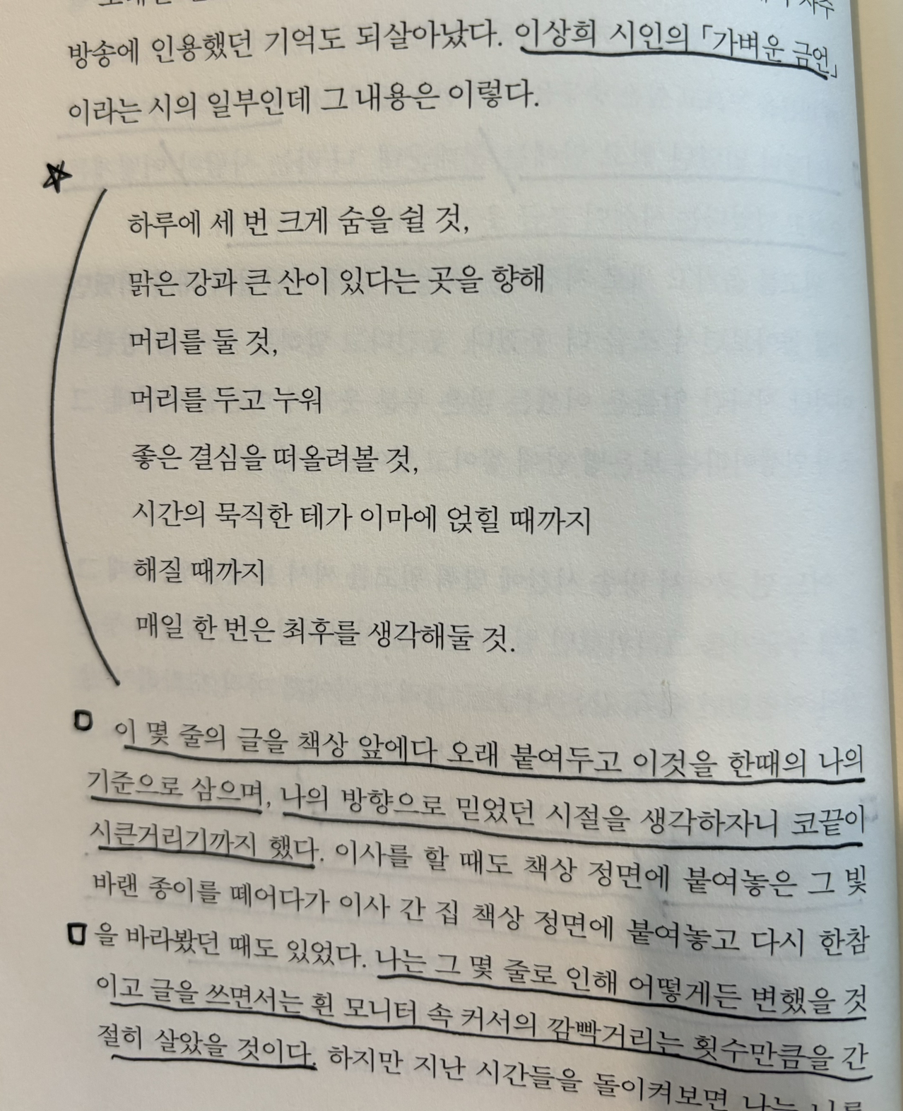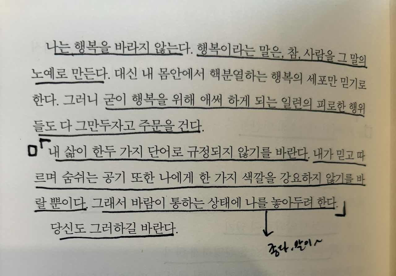 정말 편안하게 경청했다. 필기를 안했더니 기억이 드문드문 나고 잘 기억이 안 난다. 다음번에는 들으면서 키워드 위주로 필기해야겠다. 각자 와닿은 문장을 세개씩 말하고, 이유를 말했다. 작가님들마다 관점을 들을 수 있어 좋았다. 조금 아쉬웠던 것은 말을 주고 받는 토론은 할 수 없었다. 소수의 인원일 때 가능할테니까.