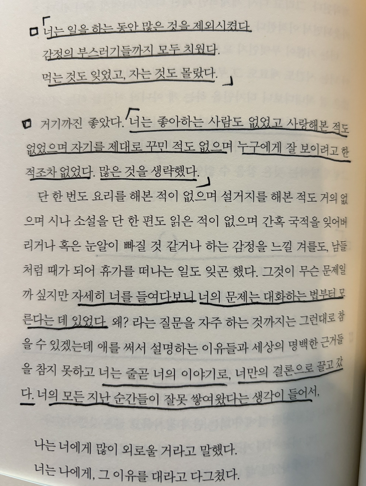 거기까진 좋았다. 너는 좋아하는 사람도 없었고 사랑해본 적도 없었으며 자기를 제대로 꾸민 적도 없으며 누구에게 잘 보이려고 한 적 조차 없었다. 많은 것을 생략했다.