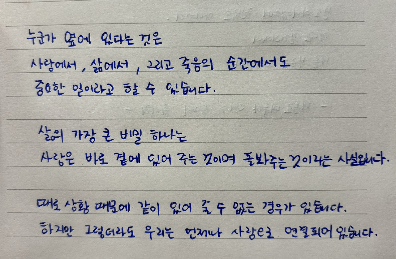 제 곁에 있는 사람들은 시간이 가면서 계속 바뀔 것입니다. 제 숨이 허락하는 마지막 순간만큼은 제가 가장 사랑하는 사람 곁에서 있으면 좋겠습니다. 그 어떤 일보다 행복한 일입니다. 그래서 저는 남편이 저보다 오래 살았으면 합니다. 저의 마지막 순간에 곁에 있어주었으면 합니다. 죽음이라는 끝이 무섭기도 하지만, 어떻게 보면 끝이 있어서 아름답습니다.