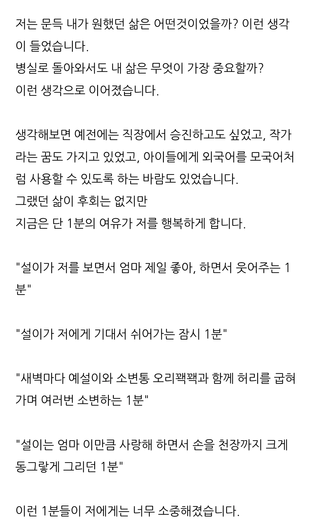 백혈병은 시간과의 싸움이라는 말에 공감합니다. 한두 달 안에 치료가 끝나는 게 아니잖아요. 3년까지 긴 시간이 필요합니다. 저희 가족이 서울이 아닌 양산부산대학교병원을 택했던 이유도 시간과의 싸움 때문이 컸어요. 첫째도 보살펴야 하는데 가족이 뿔뿔이 흩어질 수는 없으니까요. 장시간 싸움이니 체력도 키우고, 아이의 치료와 함께 치료 이후의 삶까지도 생각해야 할거 같아요. 소변, 대변, 피검사 잘 체크하고, 아이가 갑자기 살이 찌거나 빠지진 않았는지 피검사 수치는 정상적인지 잘 확인하셔야 해요. 제일 중요한 것 두 가지!!