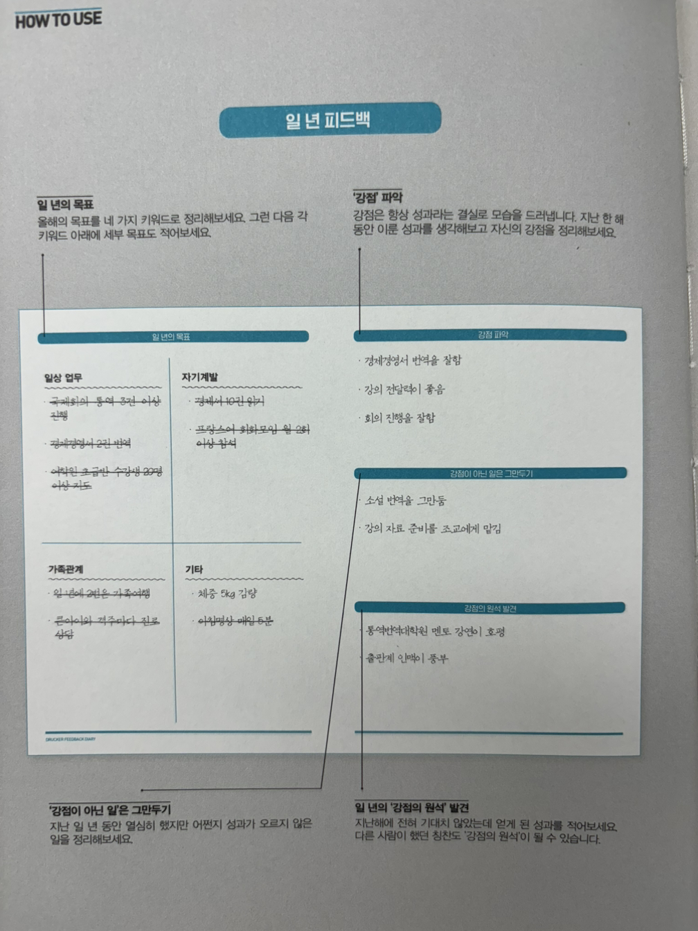 선배님과 저는 <드러커 피드백 수첩>에 포함된 다이어리로 다음주 월요일부터 목표를 향해 시도해보기로 했습니다. 만약 내년 이맘때 우리가 기록했던 것을 끈기 있게 하고 있다면 그것은 분명 우리의 강점일 것입니다. 중간에 포기한 것은 폐기해야겠지요. 목표를 설정하되, 내 건강을 챙기면서, 가족들을 챙기면서, 우리가 하고 있는 일도 해내야합니다. 무엇보다 균형이 중요합니다. 우린 엄마니까요.