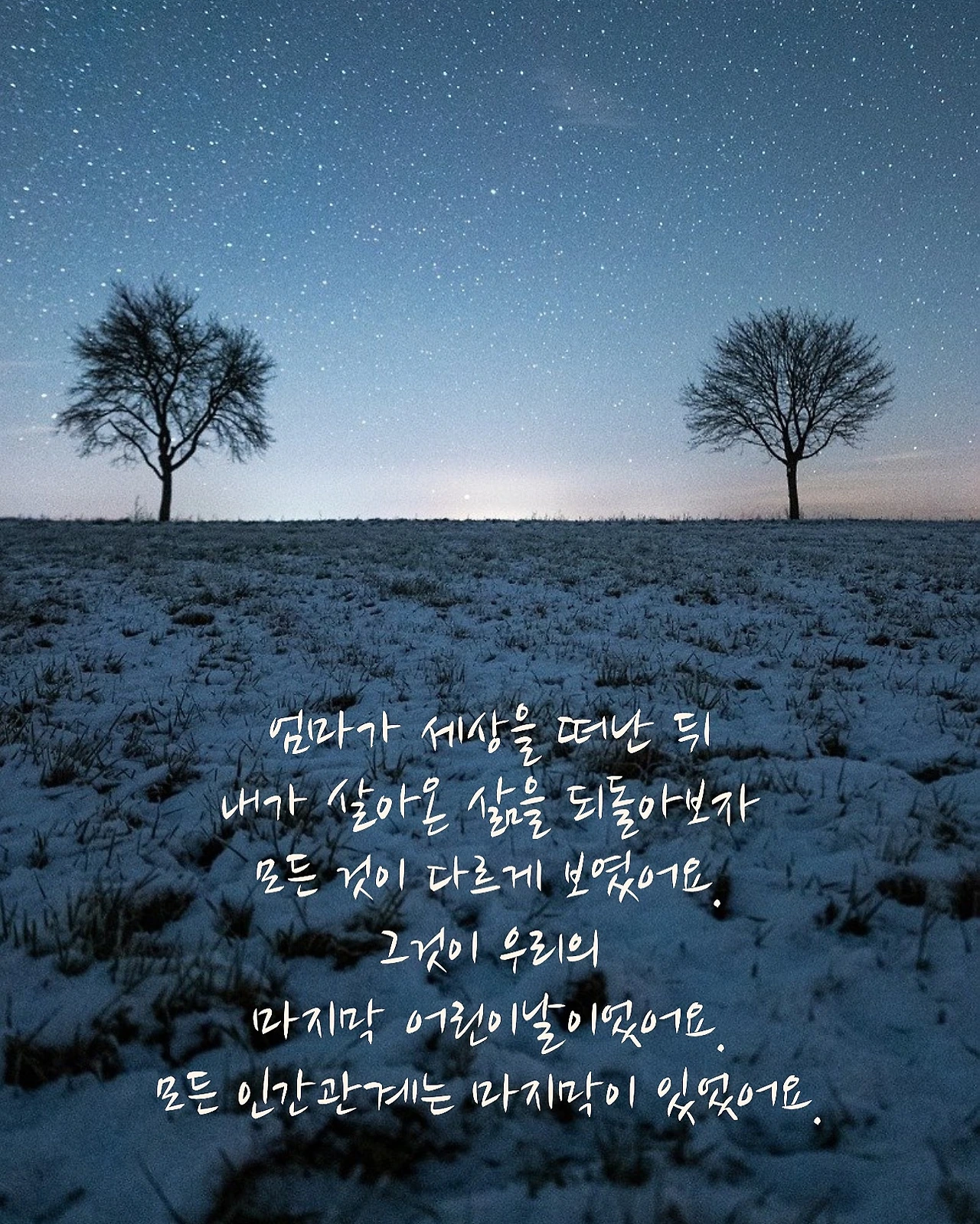 매일 일상은 이어지는데 사랑하는 사람의 빈자리는 그 어떤 것으로도 채워지지 않았습니다. 엄마의 빈자리는 그냥 계속 비어있었습니다. 식사를 하루 종일 하지 않았을 때 느껴지는 허기처럼 먹어도 먹어도 채워지지 않는 느낌이었습니다. 한 가지 확실한 것은 엄마가 떠난 뒤로 제가 바라보는 세상은 이 전과 다르다는 점이었습니다. 왜 달랐을까요. 저는 똑같은 사람인데요. 제 마음의 상태가 달랐기 때문입니다. 제가 지독하게 외롭고 쓸쓸하다고 느낀 것도 있었고, 반대로 엄마와의 마지막순간들은 저에게 고스란히 남아있었습니다.엄마는 가르쳐주셨어요. 모든 사람들과의 관계에 마지막이 있다는 사실을요. 언제가 될지 모르지만 그 마지막을 향해 저는 걸어가고 있고, 마음의 준비를 하고 있어야 한다는 것을요.