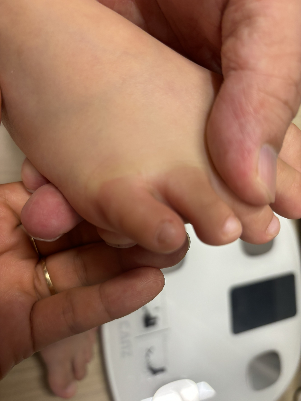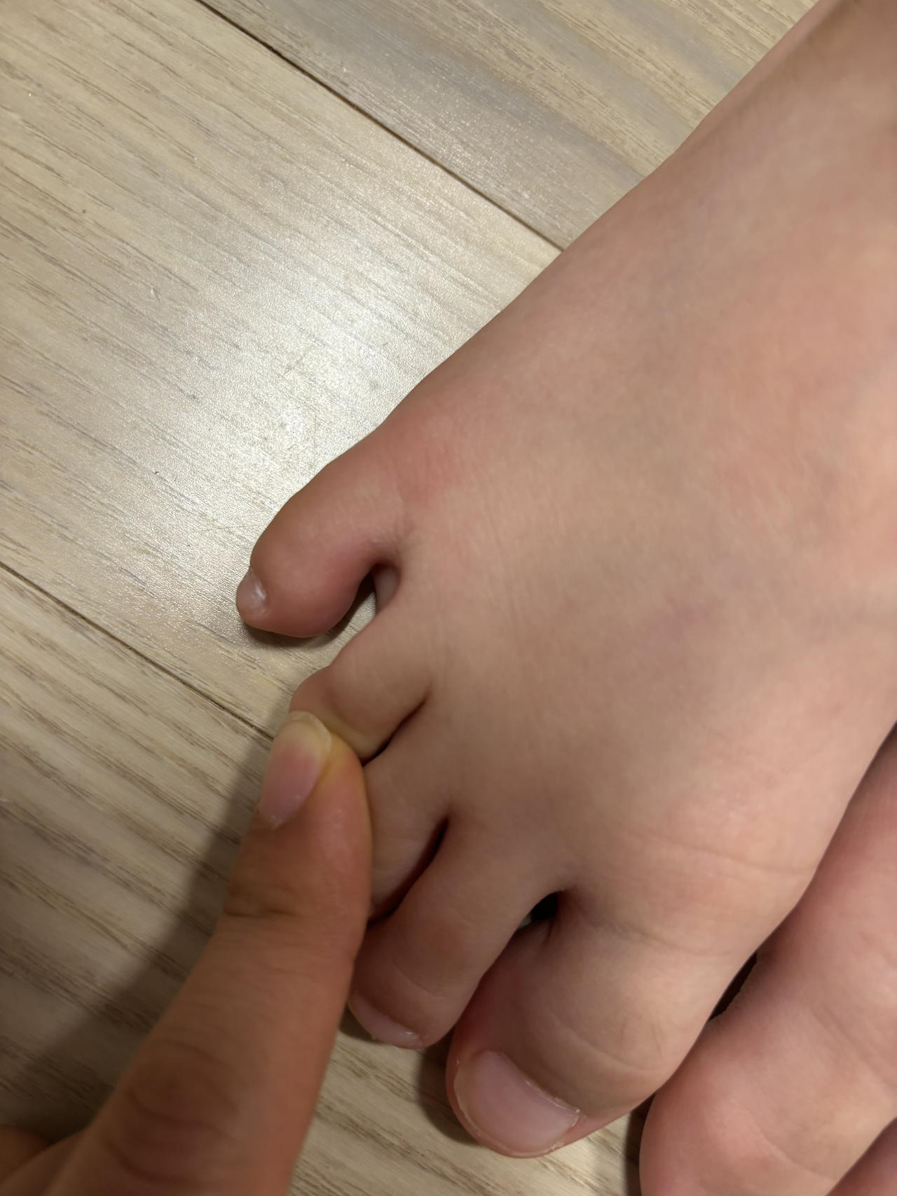 아침에 예설이가 발가락이 이상하다고 해서 보니까 새끼 발가락이 성이 났는지 부어있었어요.