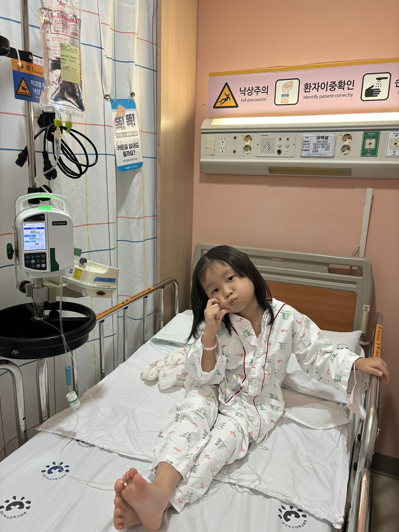 예설이는 응급실에서 케모포트 찌를 때 대성통곡하고, 팔에 알러지 반응검사한다고 주사바늘을 찔러서 크게 또 울었어요.
