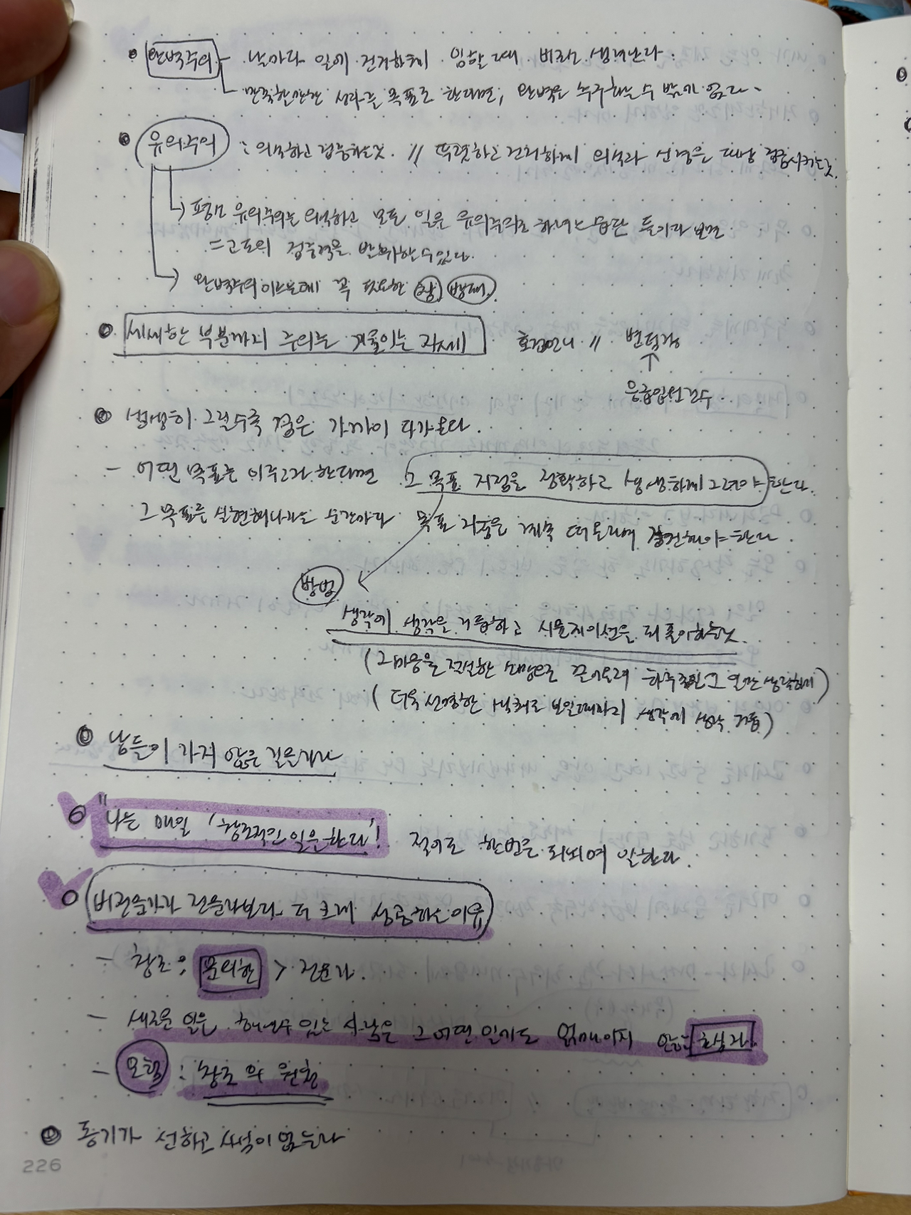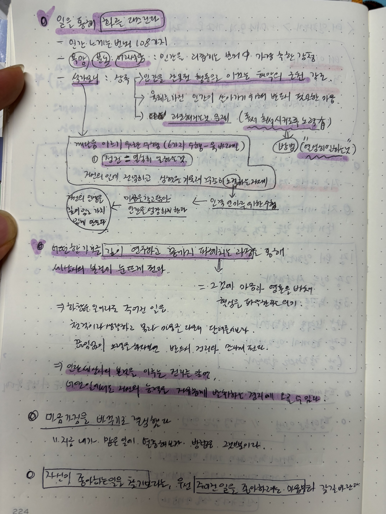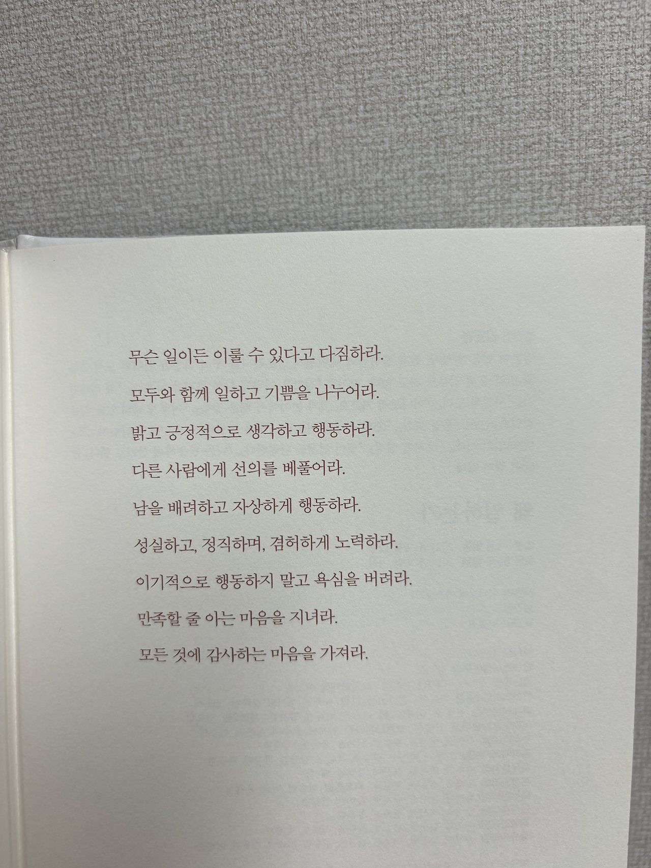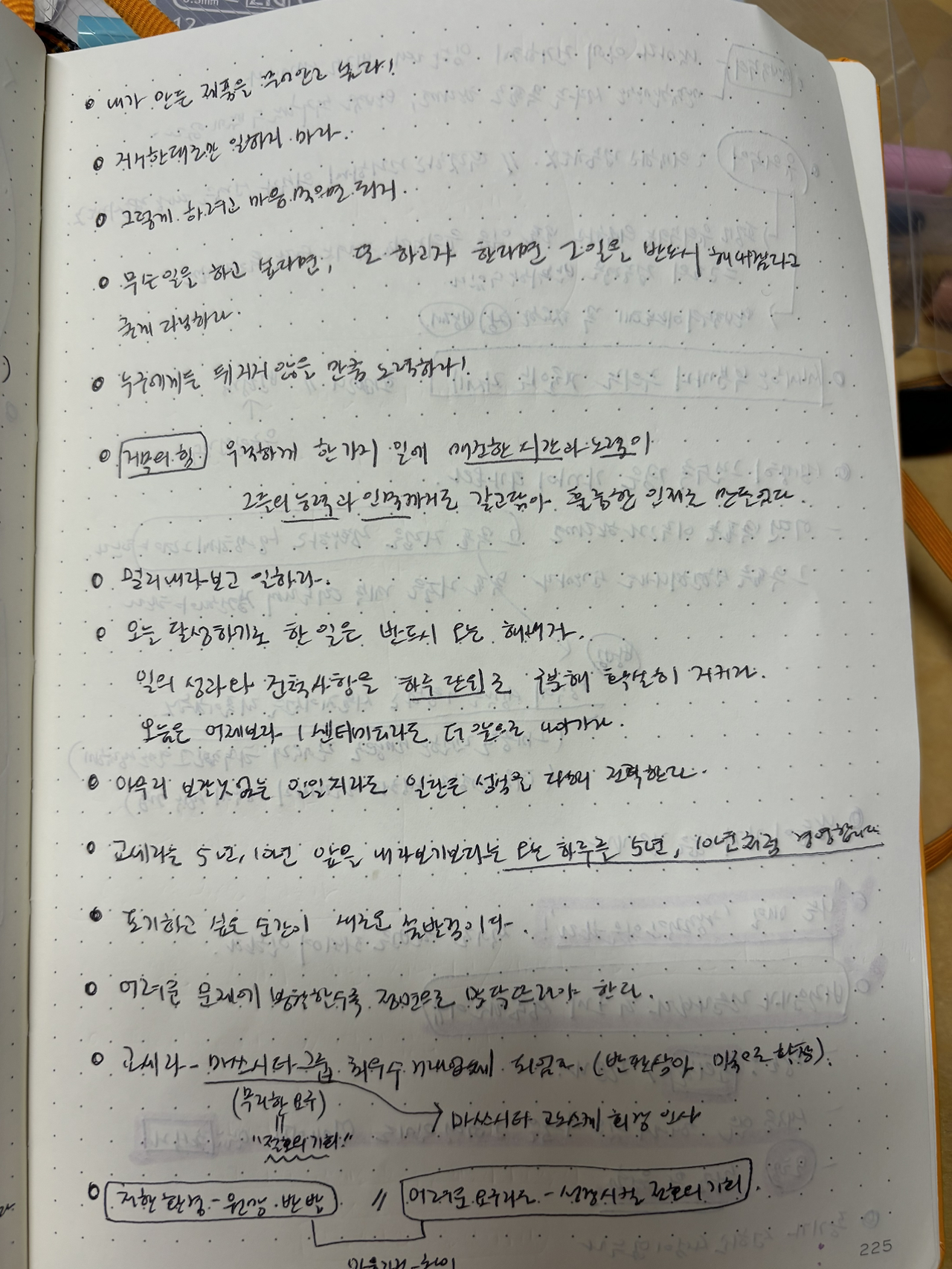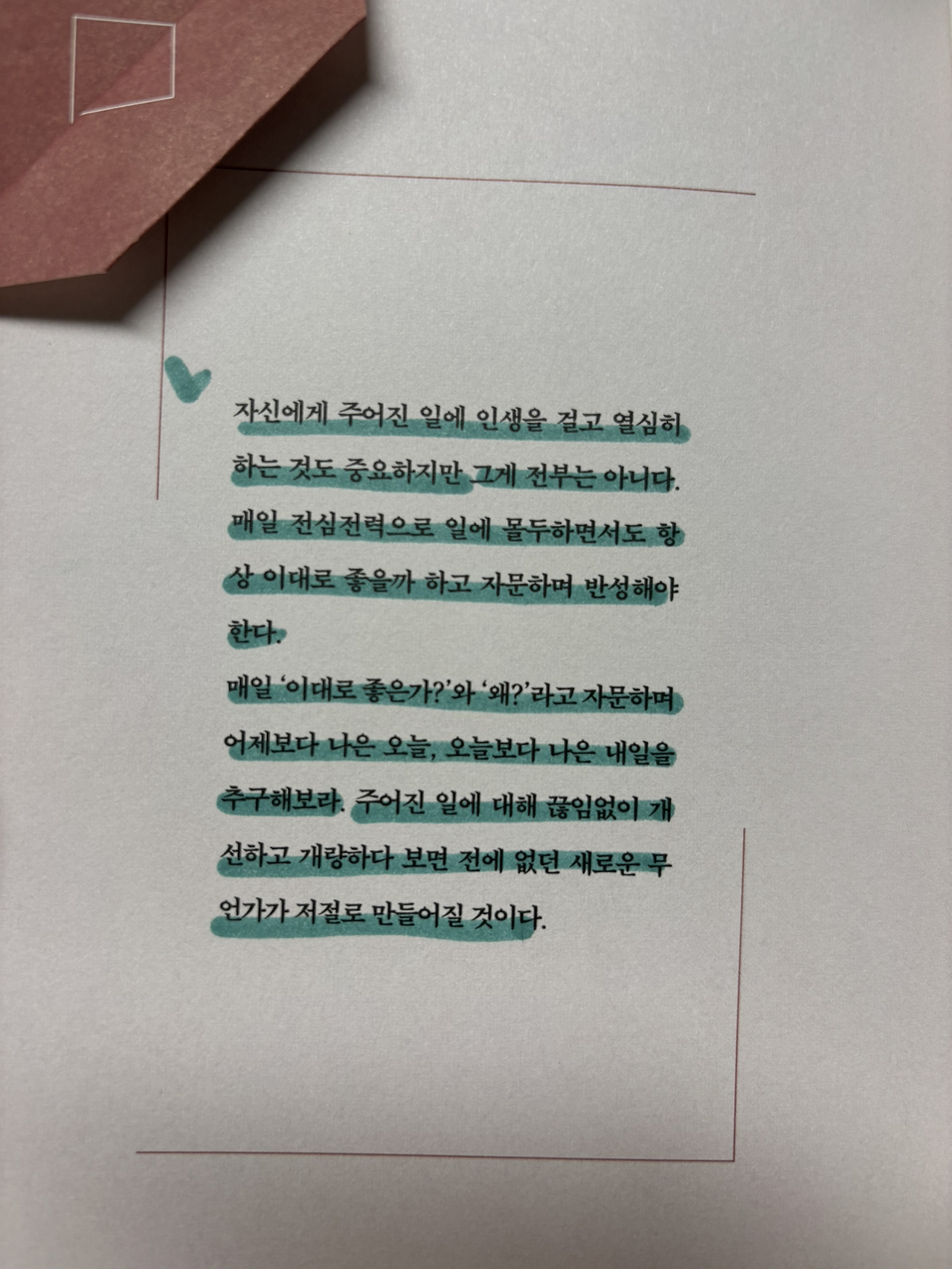 나는 이 책을 처음 읽을 때는 와 닿는 페이지 모서리만 접어 두었다. 조금 와닿는 페이지는 작게 접고, 크게 와닿는 페이지는 두 번 접었다. 두 번째 읽을 때는 접은 모서리만 찾아서 다시 읽었다. 형광펜 하나를 들고 밑줄을 쳤다. 그 다음으로 책의 처음부터 한 장씩 넘기면서 와닿는 부분은 노트에 옮겨적었다.