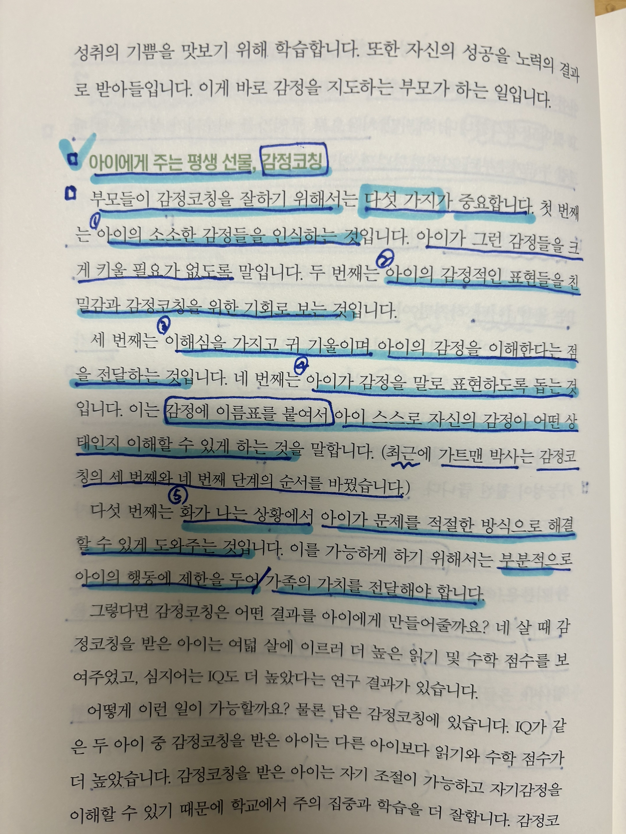 이 책은 말합니다. 부모들이 감정코칭을 잘하기 위해서는 다섯가지가 중요하다고 합니다.