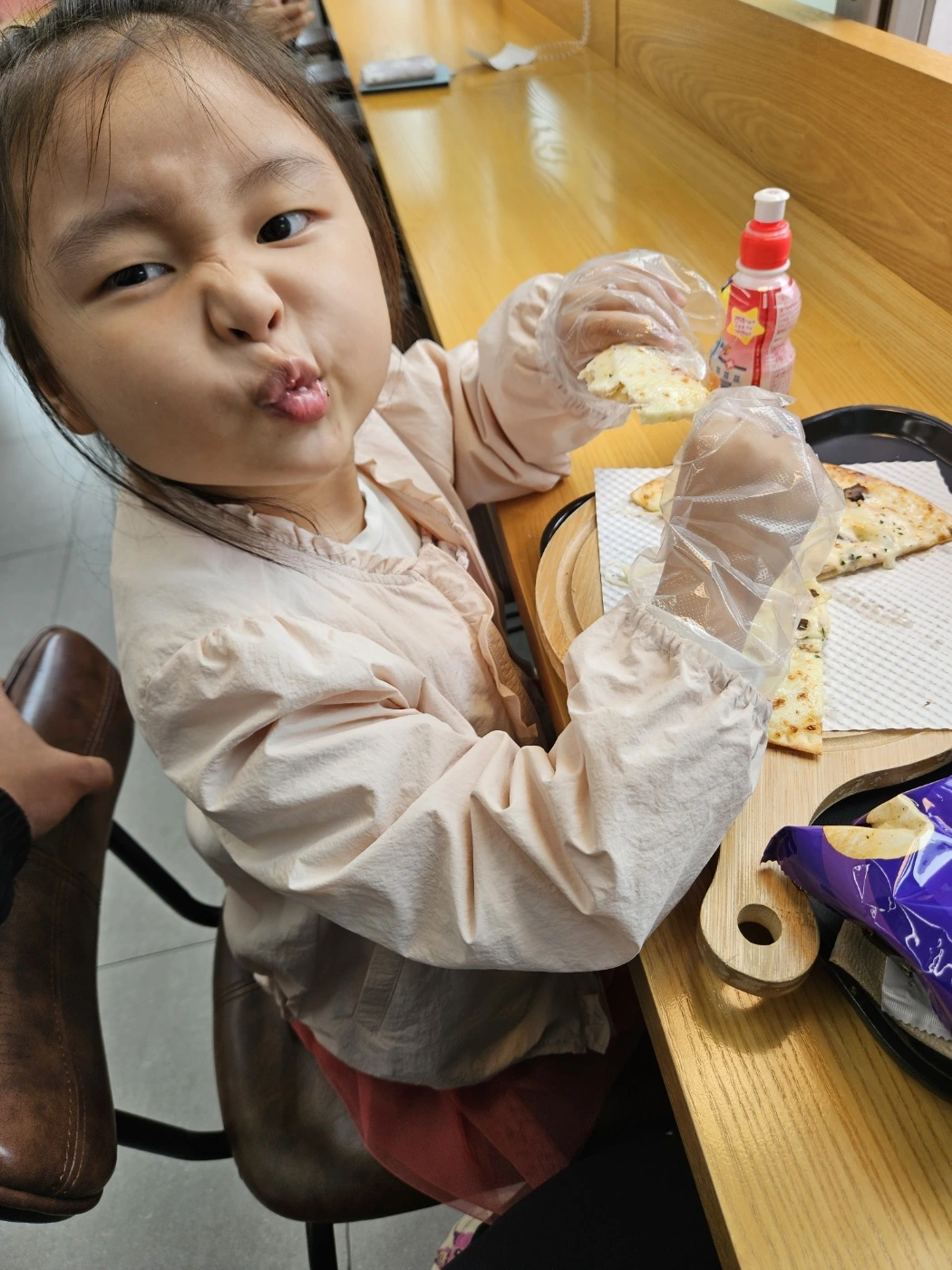 예설이는 어린이집이 아닌 양부대로 갔습니다. 입원이 있는 날입니다. 금식하고 갔는데 골수검사는 내일이라고 합니다. 피검사 뽑고 아빠랑 피자 먹었다고 해요. 피자 먹은 사진 남편이 보내주었어요. 일하면서 사진 보고 씩 한번 웃었어요.^^* 사진을 보니, 아침에 똥머리 해준 게 잘 있습니다.