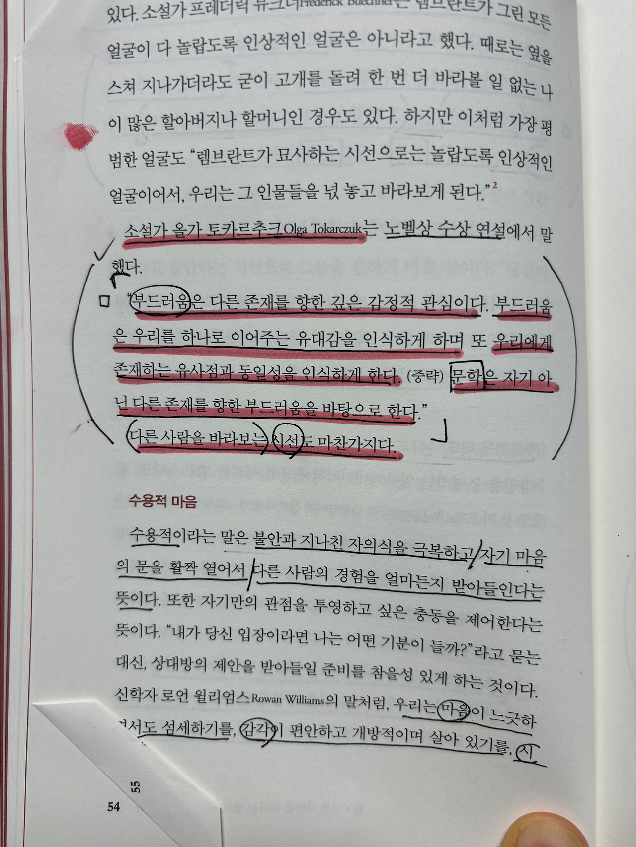 문학은 자기 아닌 다른 존재를 향햔 부드러움을 바탕으로 한다는 말이 귀에 들려온다.