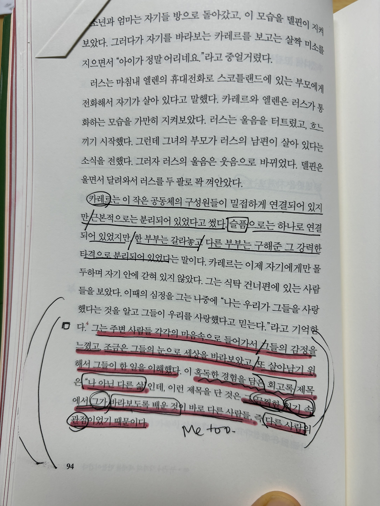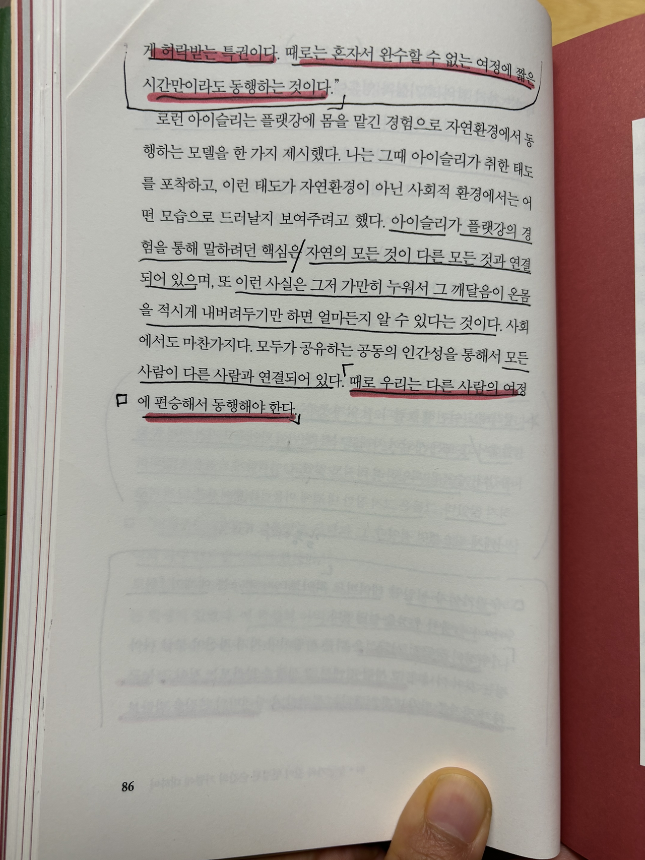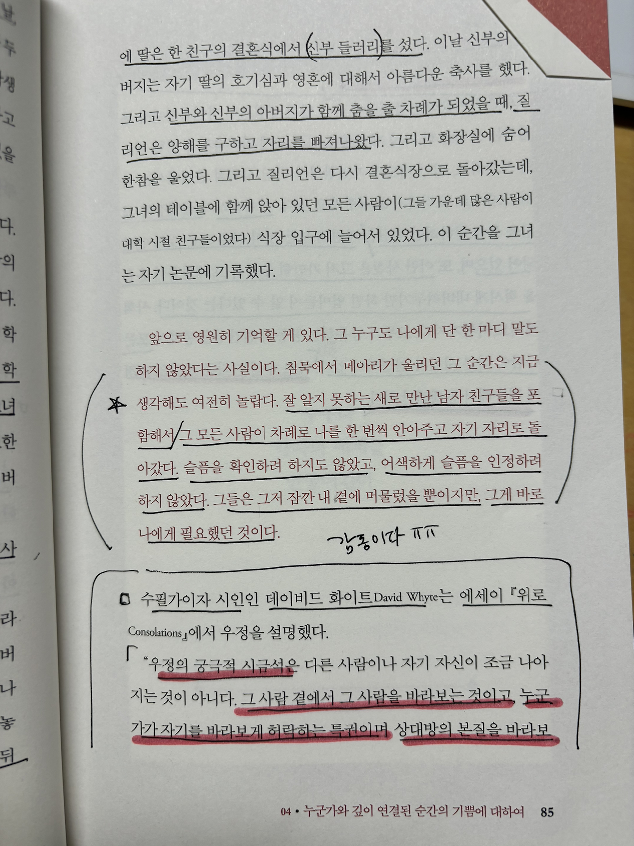 부드러움에 대해 생각했다. 이 책을 읽고 있었을 때 사무실에서 자기 감정을 쏟아낸 동료가 있었다. 내가 동료를 바라보는 시선이 한 가지인게 아쉬웠다. 그가 가지지 못했던 부드러움. 내가 다른 존재를 향해 가지지 못햇던 부드러움이 떠올랐다