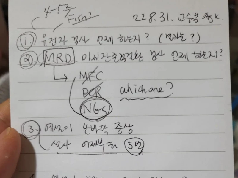 저도 지방에서도 NGS 검사하는지 궁금해서 교수님께 메모해서 물어봤던 기억이 납니다. 교수님께서 전국에 있는 모든 소아암 병원에서 NGS로 검사한다고 말해주셨어요.