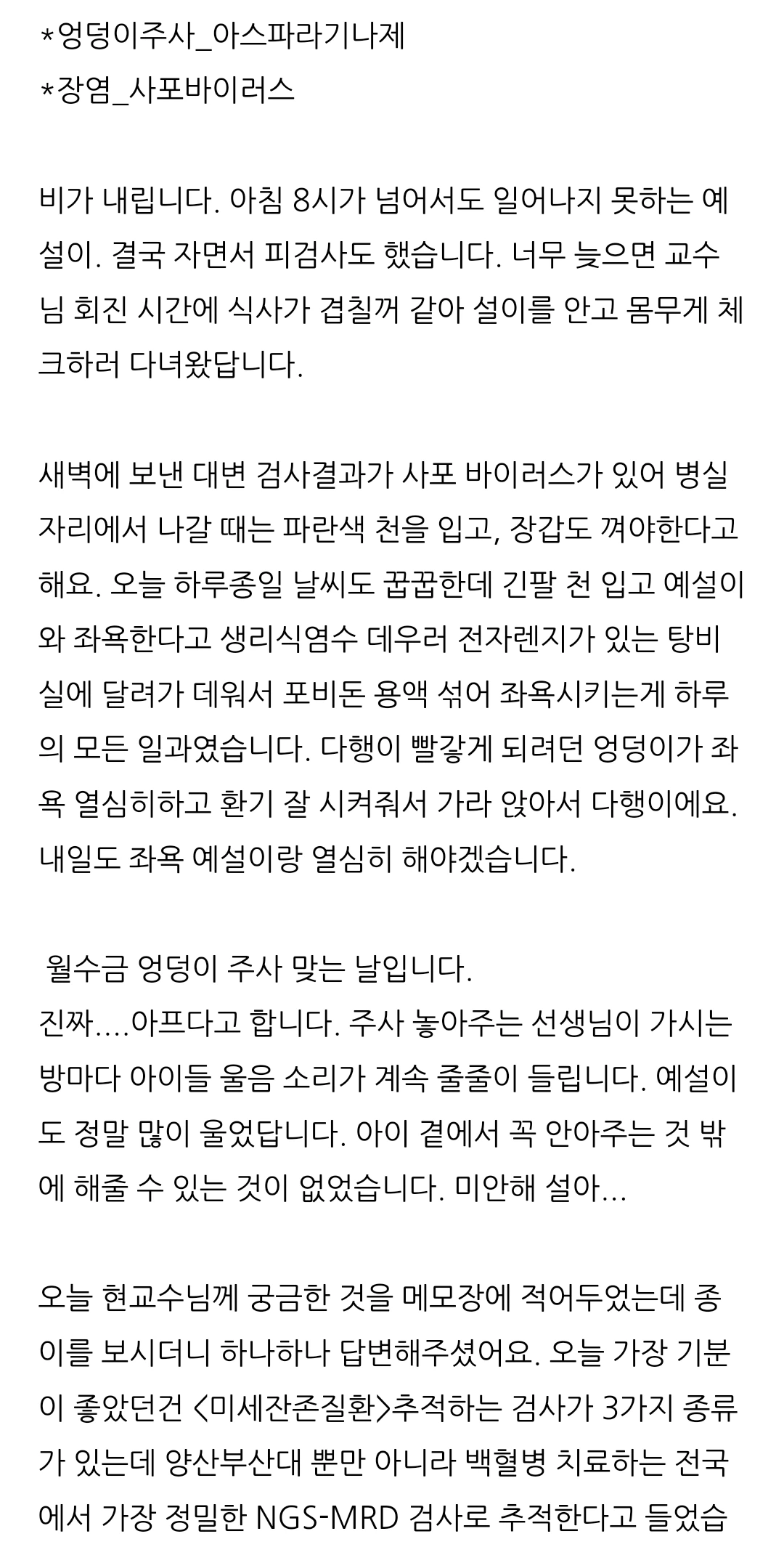 남편이 네이버카페 <아름다운 동행>에서 분당서울대병원에서 치료하시는 아버님과 카톡을 했었어요. 예설이 치료 2주 되었고, 그 아버님은 한 달 되셨을 때였어요. 아이를 살리고자 하는 마음 하나로 소통하시는 모습을 옆에서 지켜보면서 여러 가지 감정이 들었어요.