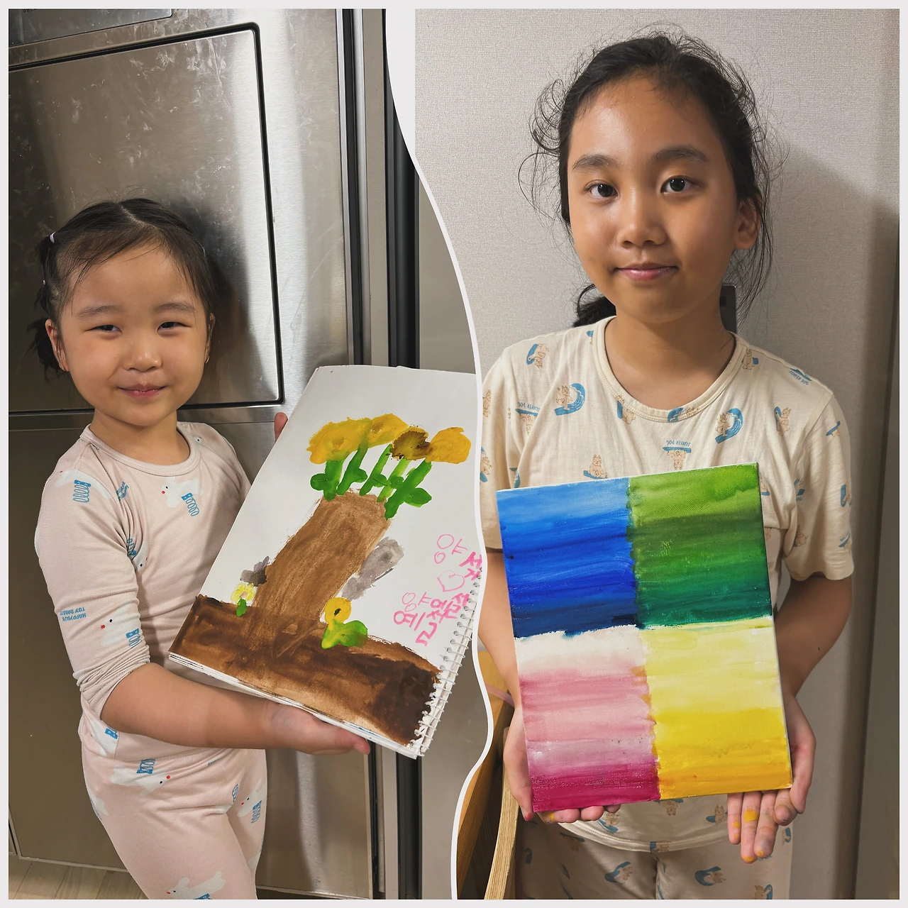 오랜만에 그림을 그리겠다는 두 딸들. 어떻게 그렸는지 봤더니 개성있게 그렸습니다. 느낌 있는 예빈이 그림과 밝은톤의 예설이 그림까지.