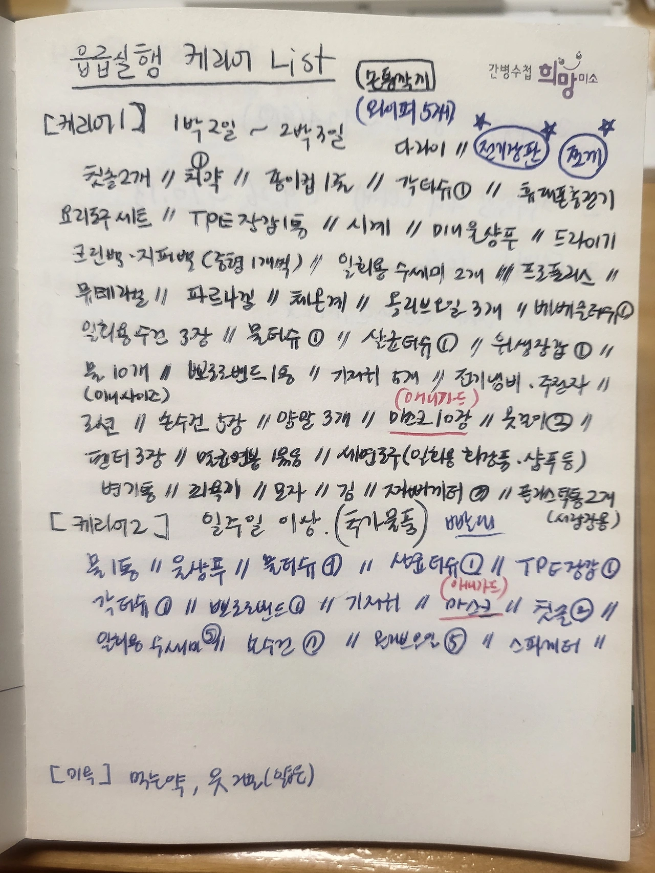 제가 간병수첩 뒷장에 정리해 둔 것이 있더라고요. 하은이 보살피시면서 겹치는 물건들이 있다면 퇴원하시고 입원 캐리어 정리하실 때 참고하세요^^*