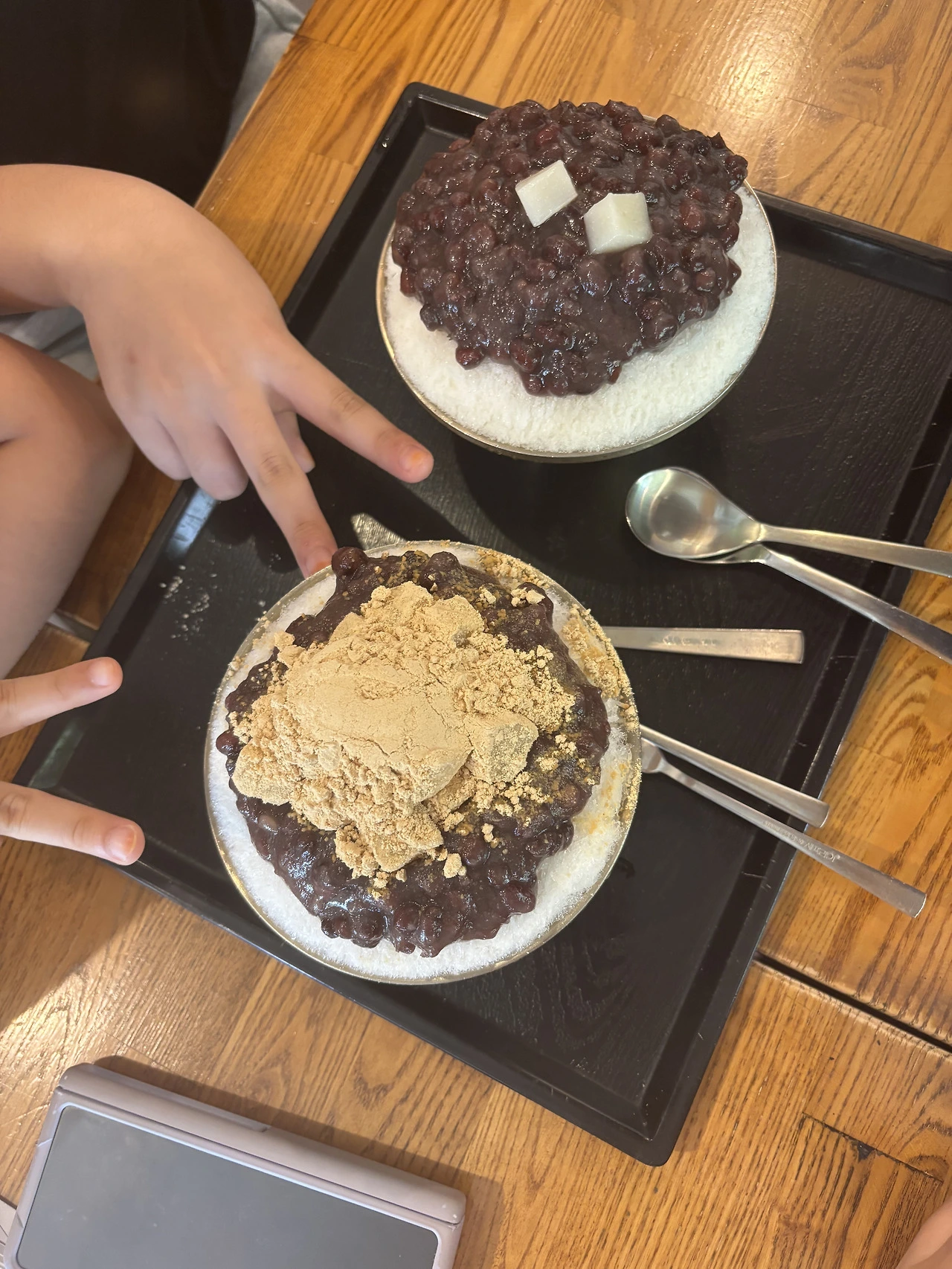 한의원 근처 팥빙수 가게에 들렀다. 점심 전이었지만 시원한 게 먹고 싶었다. 예설이는 팥을 싫어해서 얼음과 떡만 골라 먹었다. 구운 떡을 추가로 주문해 인절미 가루에 찍어 먹으니 고소했다.