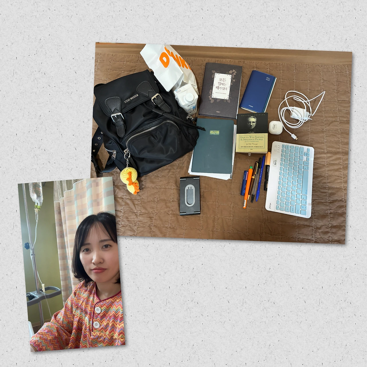 하루만 있을 건데도 짐은 꽤 많다. 책, 노트, 블루투스 키보드, 휴대폰 거치대, 이어폰, 충전기. 물과 간식까지 빠짐없이 챙겼다. 타이핑하려고 링거 바늘도 일부러 왼손에 꽂았다.