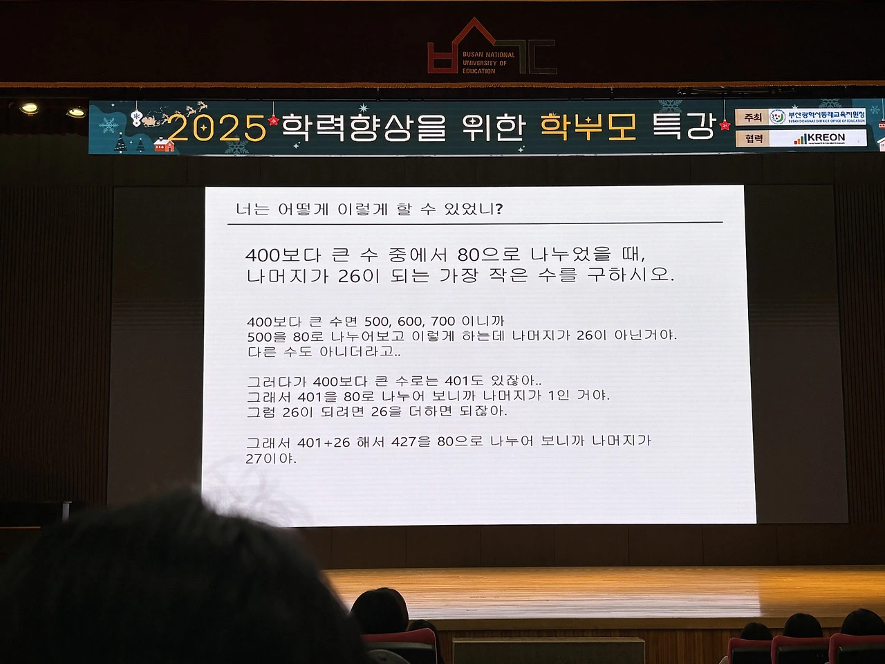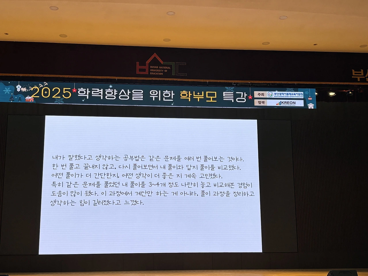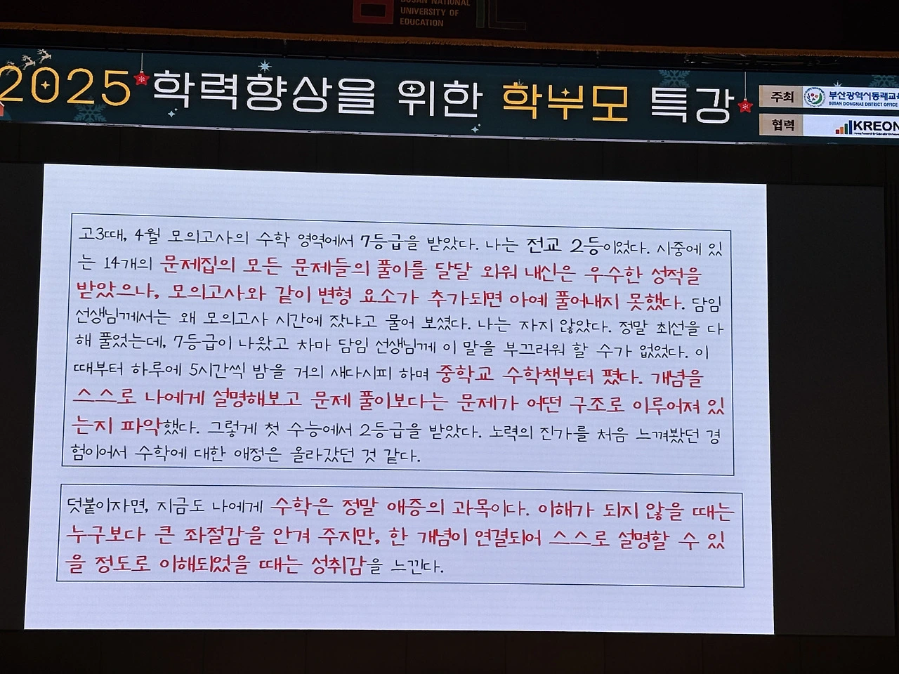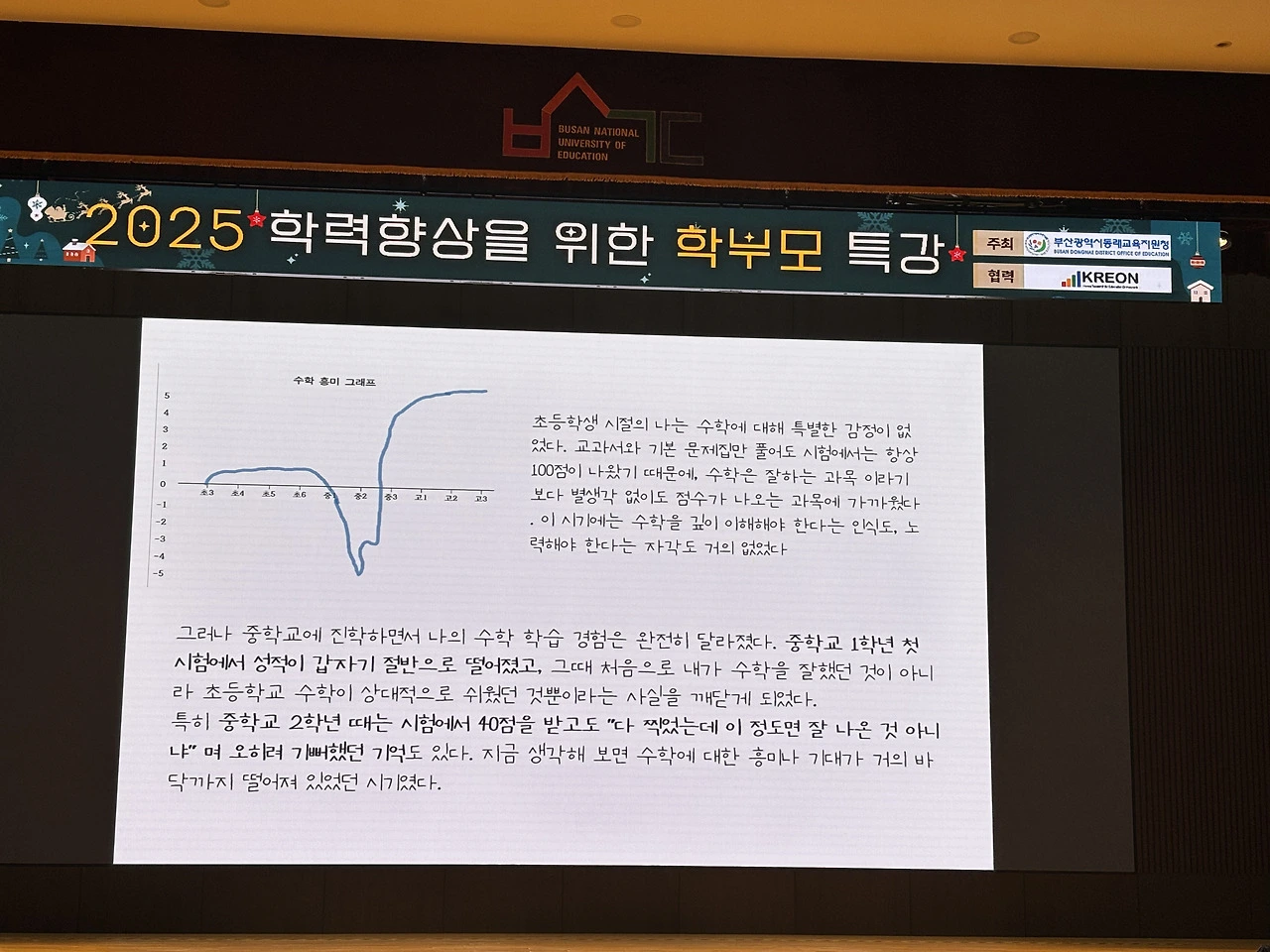 강사는 초등학교 4학년 때, 수학 경시대회에서 대상을 받았다고 교실에서 일어나 소개되었던 순간을 아직도 생생히 기억한다고 했다.