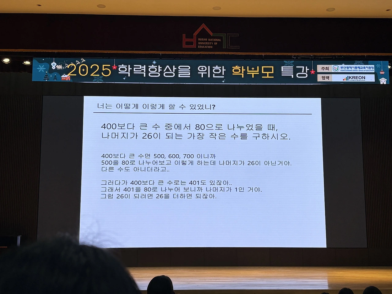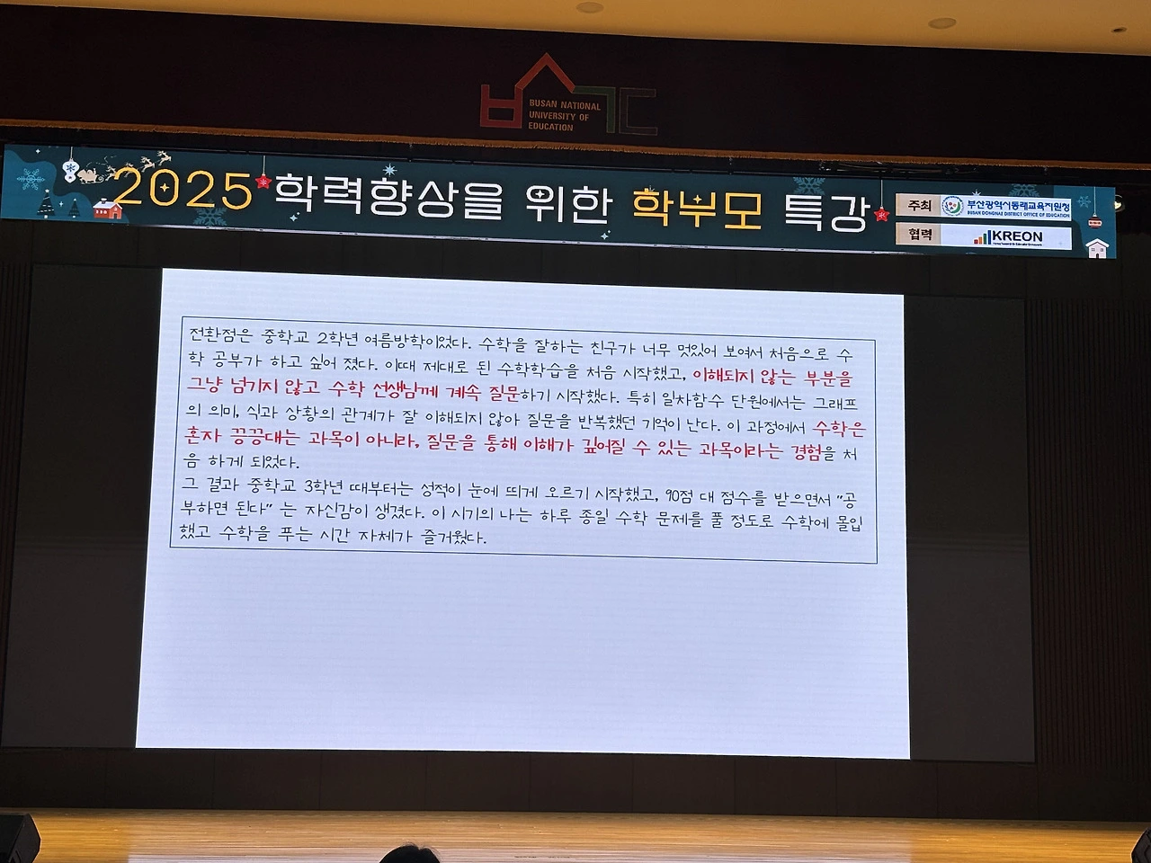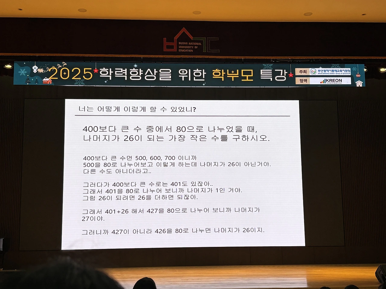 강사는 초등학교 4학년 때, 수학 경시대회에서 대상을 받았다고 교실에서 일어나 소개되었던 순간을 아직도 생생히 기억한다고 했다.