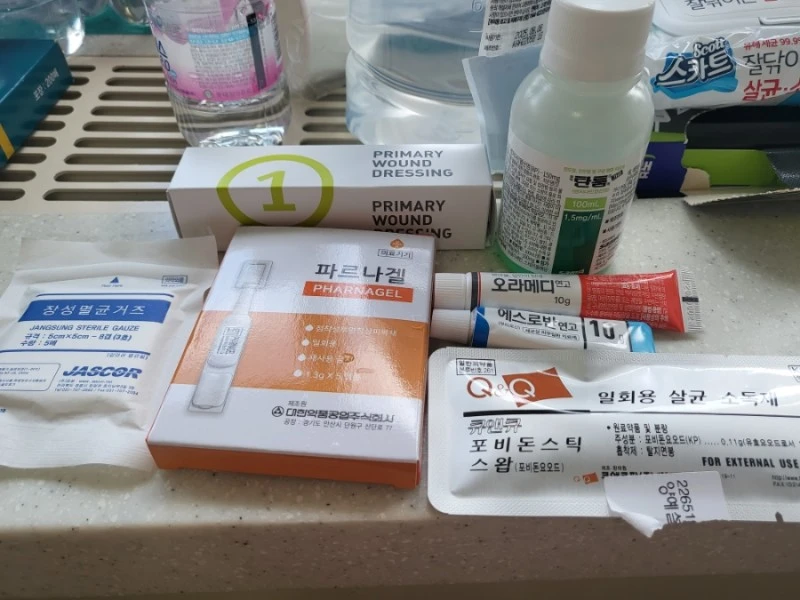 이렇게 매일 하루 세 번씩 발 씻기고 소독하고 연고를 각기 다르게 발랐어요. 상처 선생님이 추천해 주신 운디드 드레싱과 파르나겔이 정말 효과 있었어요. 파르나겔은 천연 제품이라 좋았어요. 치과에서 많이 추천해 주신데요. 예설이 입안에 상처 나거나 구내염 왔을 때도 많이 썼어요. 탄툼은 일주일 이상 사용하면 이빨이 약해진다고 하더라고요. 탄툼은 구내염이 진짜 심할 때만 썼어요. 파르나겔 신봉자가 되었답니다. 입안에도 바르고 몸에 상처 났을 때도 에스로반과 운디드 드레싱과 번갈아가면서 하니까 상처가 빨리 낫더라고요.^^*