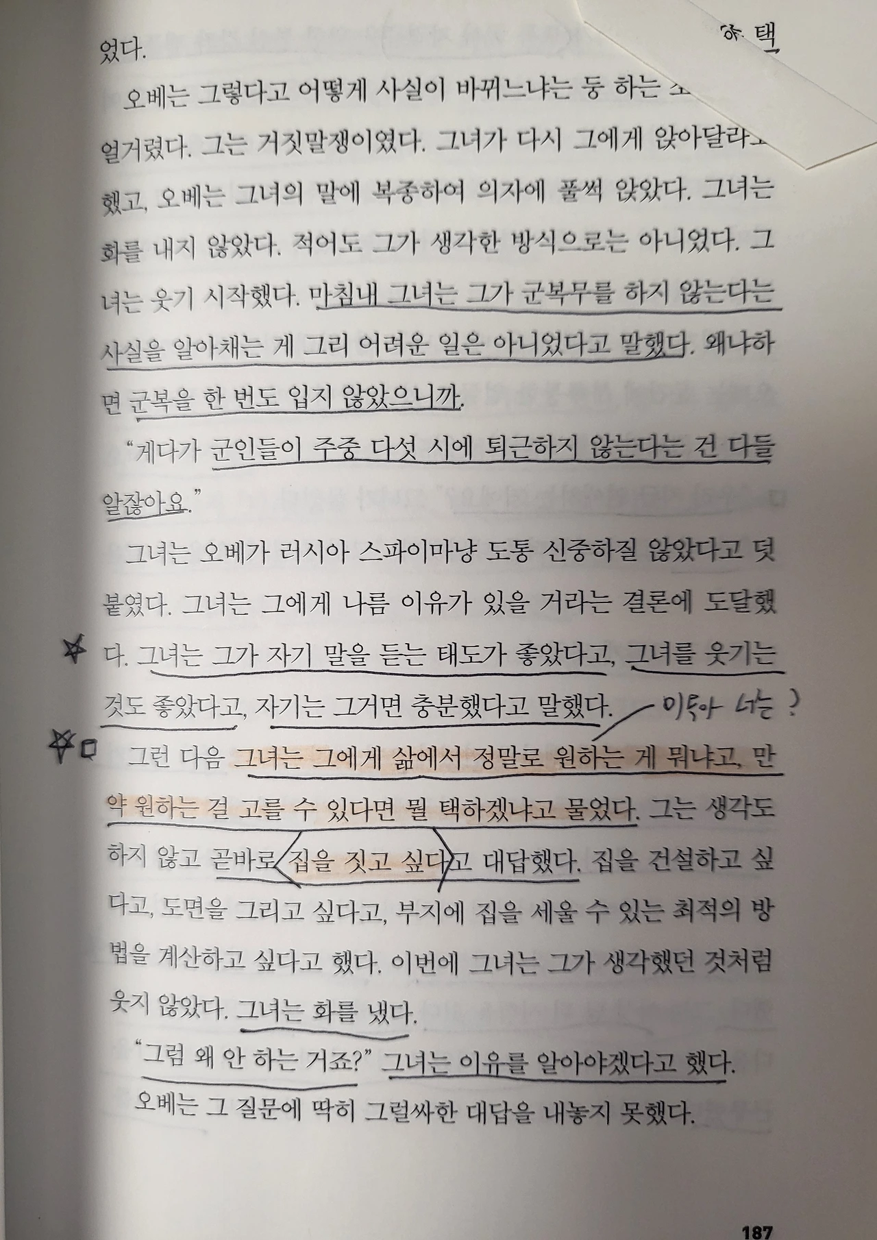 쇼나는 오베에게 질문을 던졌다. 그에게 삶에서 원하는 게 뭐냐고, 만약 원하는 걸 고를 수 있다면 뭘 택하겠냐고 물었다. 오베는 생각도 하지 않고 곧바로 집을 짓고 싶다고 대답했다. (나에게 이 질문을 해봤다. 미옥아 넌? 나는 오늘 블로그 프로필 소개글을 바꿨다. 이 질문 덕분에.)