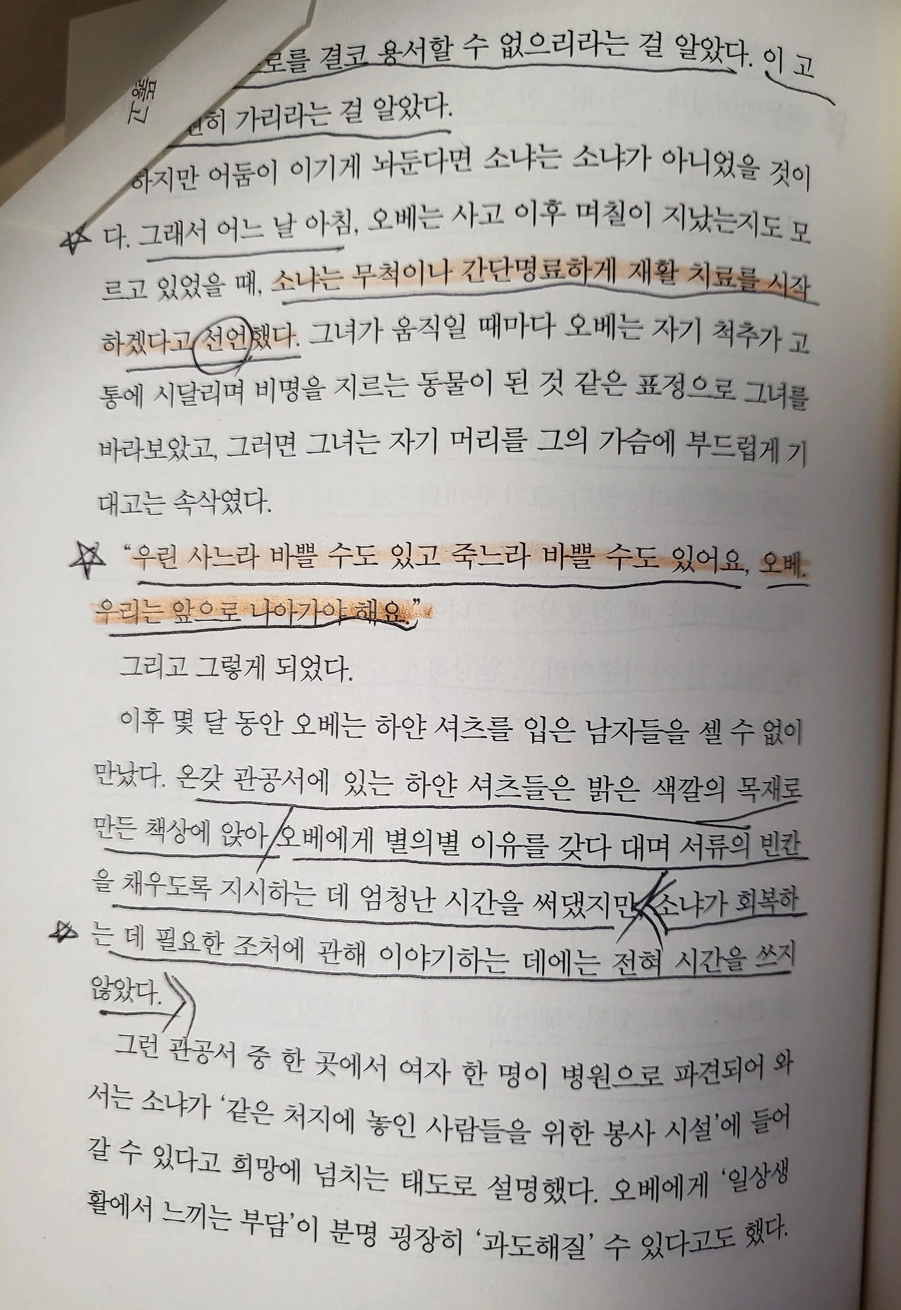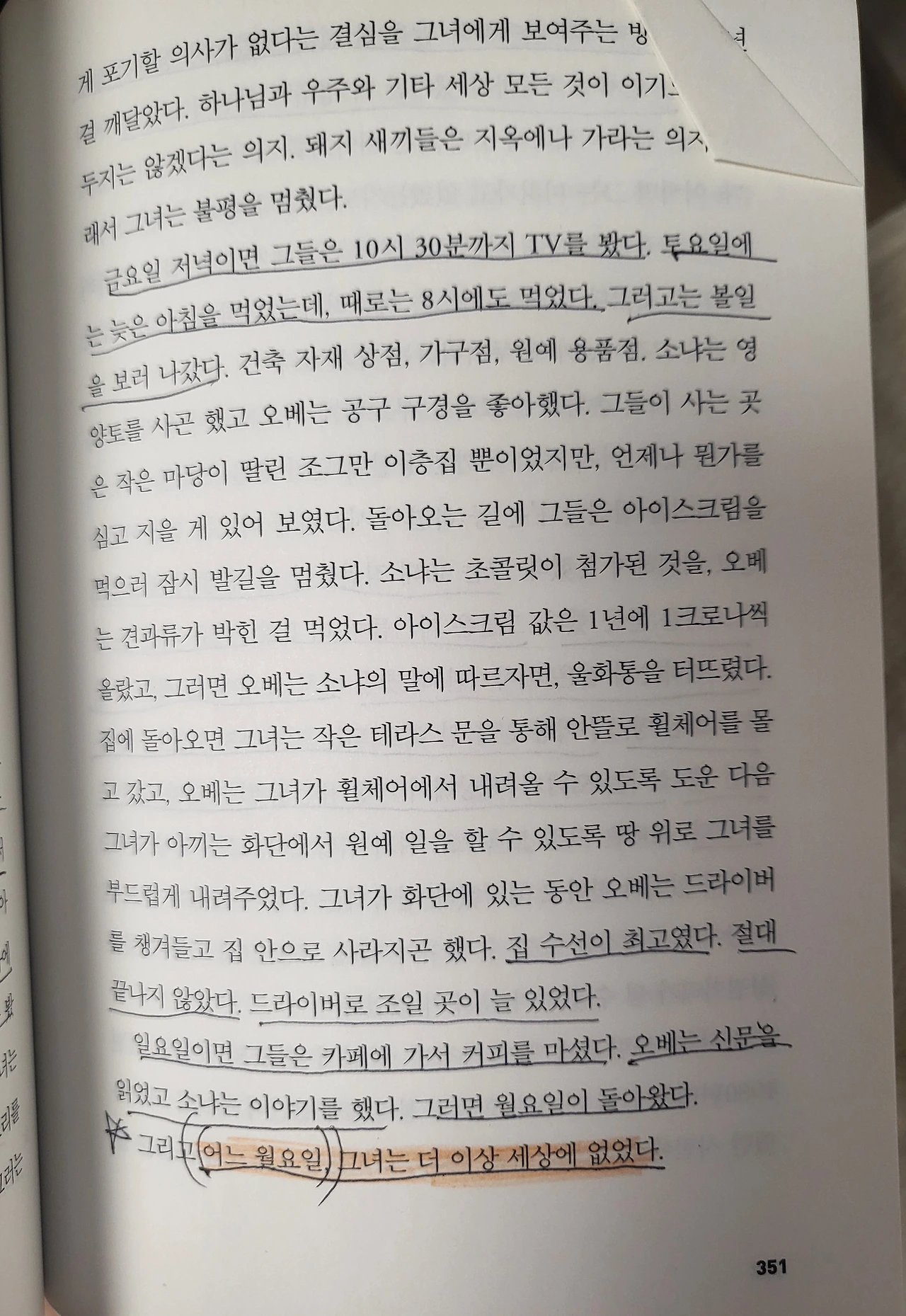 남편에게 이 책을 읽어보라고 주어야겠다. 이 책은 표현이 재밌는 게 많다. 예를 들면 "59세의 남자와 10대 젊은이는 몇 미터 거리를 둔 채 눈을 발로 차고 있었다. 마치 기억을 아리저리 발로 차듯." 이런 표현들이 읽을 때 재밌다. 영화가 있던데 봐야겠다. 책과 어떤 다른 느낌이 있는지 궁금하다. 코로나 격리 덕분에 하루종일 책만 읽고 싶다던 희망을 실천할 수 있는 귀한 5일을 얻게 되었다. 내 이름에 작가라는 명칭을 떳떳하게 말할 수 있도록 읽고 쓰는 삶을 잘 이어가야겠다고 마음속으로 다짐해 본다.
