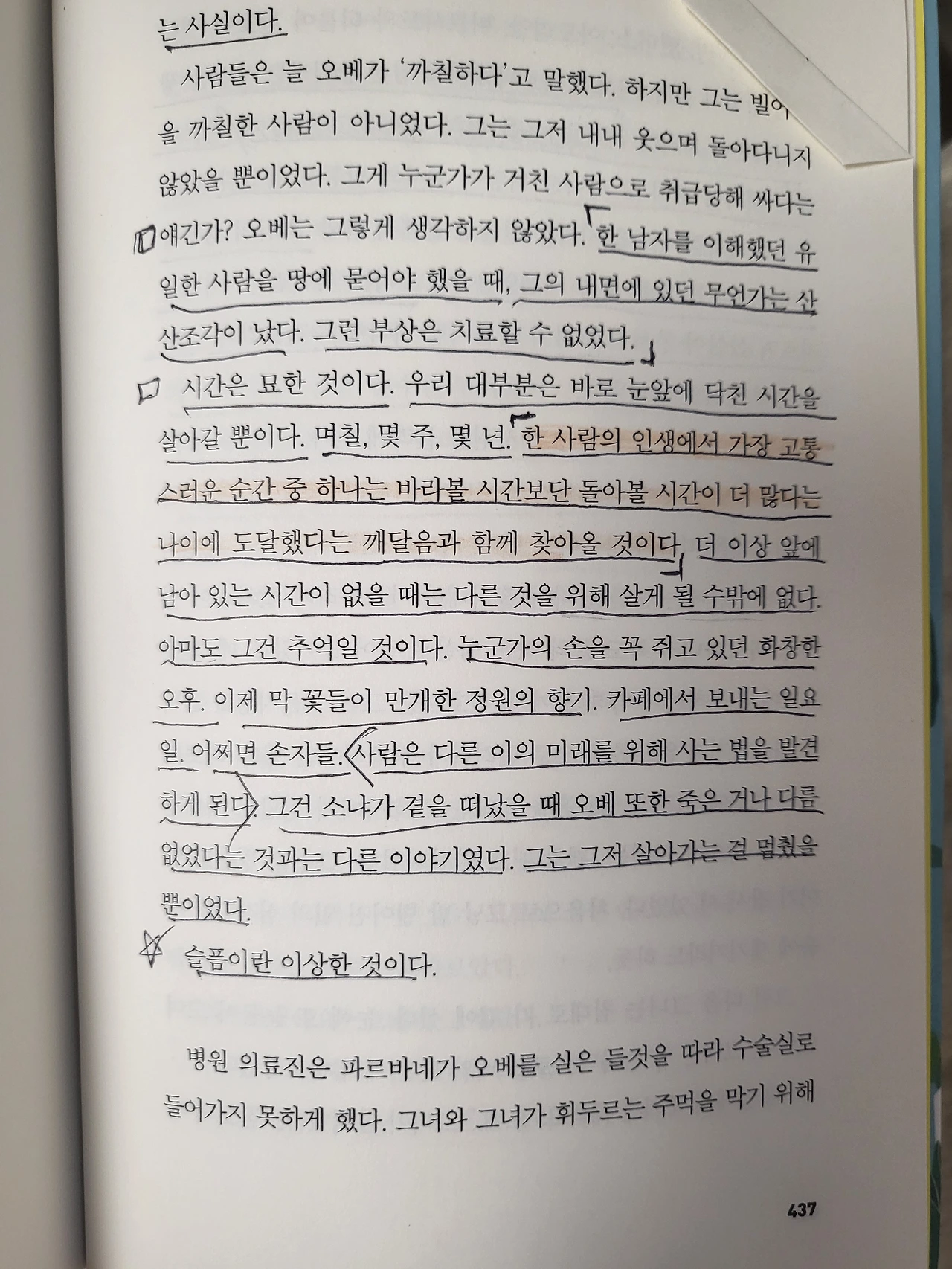 오베라는 남자의 어린 시절부터 아내인 쇼나를 만나고, 그녀를 하늘로 떠나보내고, 그 빈자리에 말도 안 되게 제 멋대로인 파르바네 가족들이 오고 나서 벌어졌던 일이 펼쳐졌다. 오베는 마침내 원했던 소냐 곁에 가게 되었다. 오베의 삶의 이야기가 우리의 이야기가 아닐까. 각자 삶이라는 디테일은 다르겠지만 태어나서 생을 마칠 때까지 곁에 있는 누군가는 함께한다는 것은 같지 않을까. 그래서 덜 외로운 게 아닐까. 그리고 오베가 자신의 삶을 정리할 때 모든 서류들을 정리했던 것처럼 내 삶을 정리할 필요가 있다는 생각도 해본다. 예전에 써두었던 유서를 찾아봐야겠다. 업데이트가 필요하겠다.