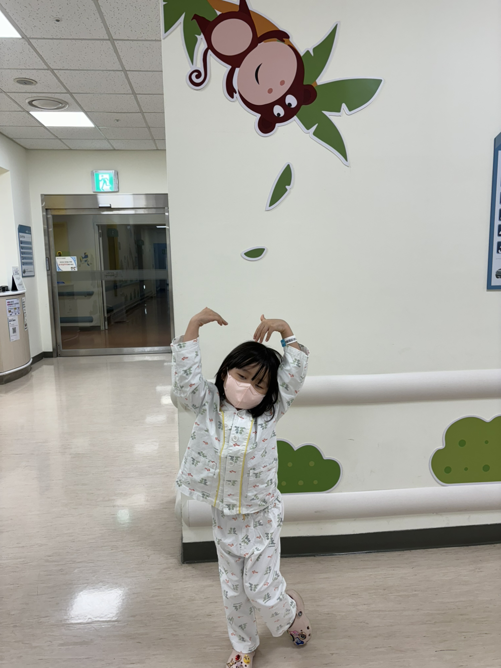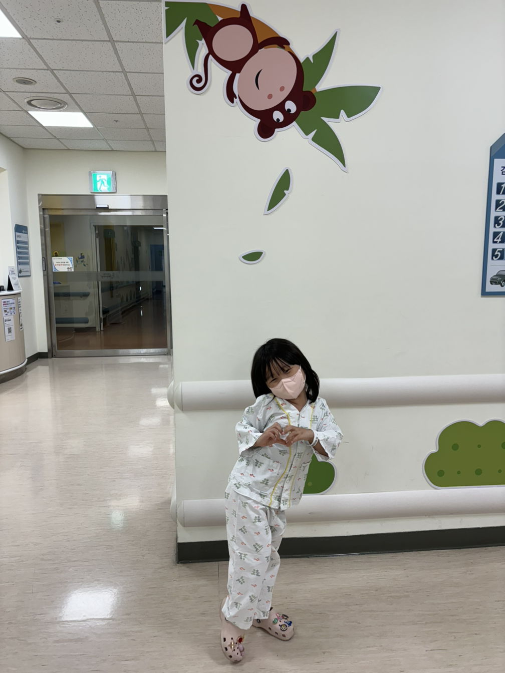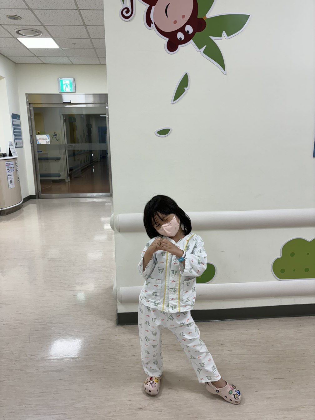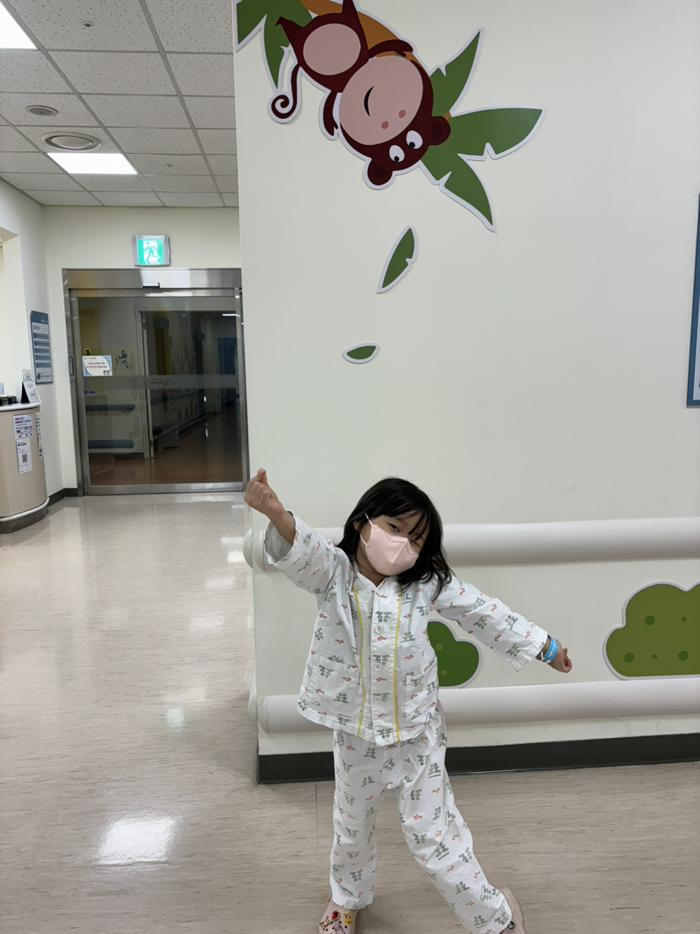 오랜만에 83병동을 오니까 엣날 생각도 나고 그렇네요. 예설이가 그동안 키도 몸무게도 많이 크고 자랐어요. 5세 병원복을 입으니까 예전에는 옷이 컸는데 지금은 작아졌어요. 오늘 케모포트 연결할 때 많이 울었지만 용기내어 치료해주어 너무 기특했어요. 내일 무진이랑 잘퇴원하고, 라윤이도 엉주 치료하고 퇴원할꺼라 믿어요.