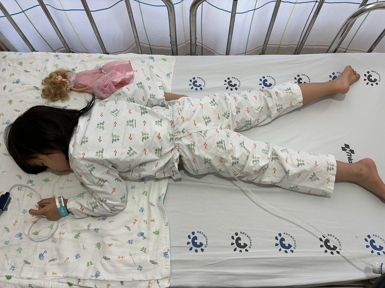 예설이가 2시 40분 쯤에 나와서 오후 3시 30분까지 엎드려 누워있었어요. 척수항암 하기 직전에 잠이 온다고 해서 잠깐 자고있었는데 척수 항암 시작할 때 안잘까봐 깨우라고 하셔서 예설양 잠온다고 계속 울었답니다....ㅠㅜ