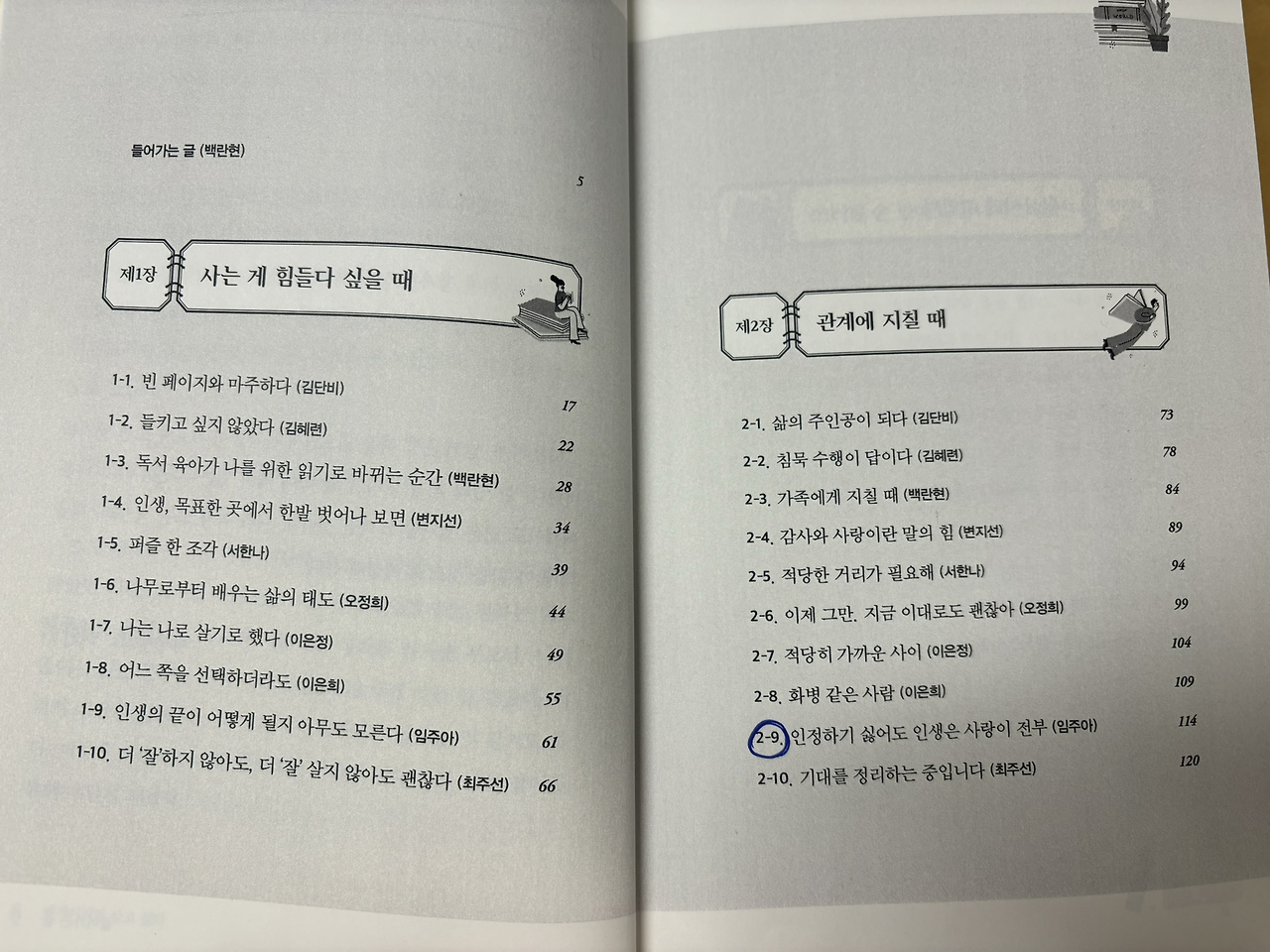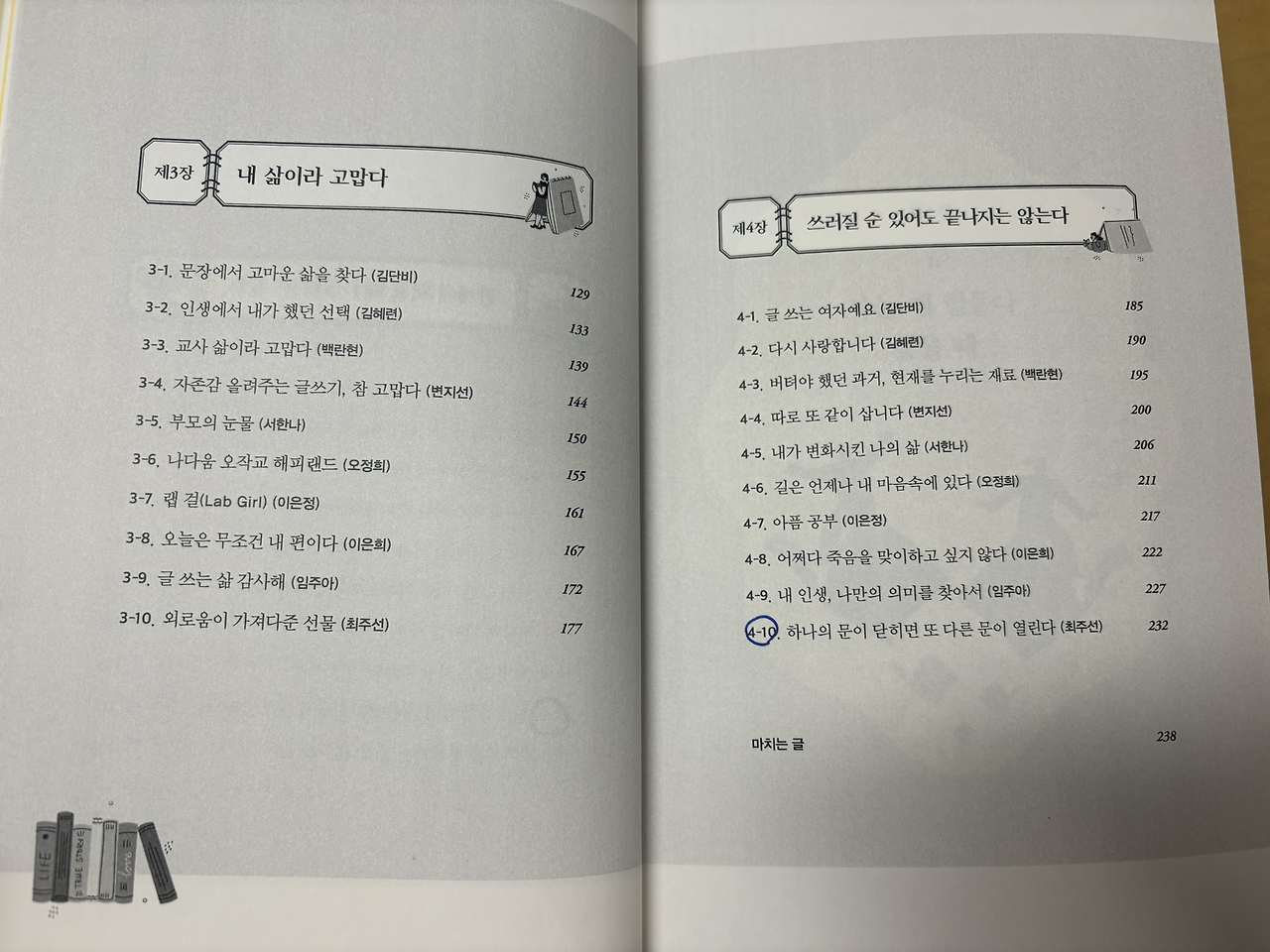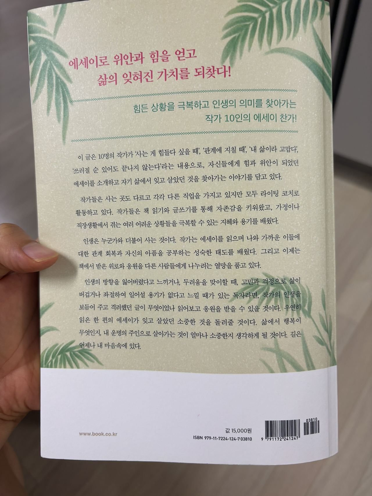이 책은 10명의 작가님들의 글이 담겨있다. 4장으로 나눠져 있는데 주제마다 작가님들이 에세이 한 권을 소개해주시고, 자신의 느낌이 담겨있다. 나는 연결해서 읽고 싶어 어제부터 읽었는데 이틀에 걸쳐서 완독했다. Alone 이라는 책을 읽었을 때가 생각났다. 여러 작가님들의 생각과 삶이 담겨 있어 한꺼번에 읽는 맛이 있었다. <에세이처럼 살고 싶다>도 한 작가님의 글을 1장, 2장, 3장, 4장까지 연결해서 읽었다. 내가 만난분도 있었고, 얼굴도 모르는 분도 있었다. 열분의 이야기라서 그런지, 내가 평소 생각했던 주제가 많았다. 그래서 더 좋았다. 삶과 죽음에 대한 생각, 사람에 대한 생각, 일에 대한 생각, 열정에 대한 생각, 가족에 대한 생각.... 평소 자주 생각하는 것들을 한꺼번에 만날 수 있어 너무 좋았다. 나는 이 책을 읽고 실천해보고 싶은 것이 생겼다.