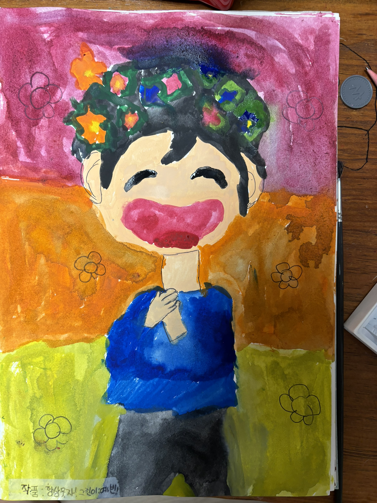 내가 존경하는 분의 카톡 프로필 사진을 보여준 적이 있는데 물감놀이 하고싶어하는 예설이와 웃고있는 이 사진을 그리겠단다. 프린트해서 주었다. 가운데 두고 따라 그린다.