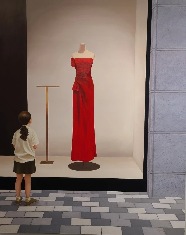 쇼윈도는 자본주의 상품시장이 갖는 화려하고 과장된 모습을 보여줍니다. 회색의 거리에서 조명 아래 놓인 드레스를 크게 부각하고 더 두드러져 보이는 화려한 색감이 사람의 욕망을 더 강하게 연출합니다. 작품을 보면 여자아이가 드레스를 보고 있습니다. 나이대에 상관없이 우리 모두 욕망 앞에서는 어쩔 수 없음을 나타냅니다.