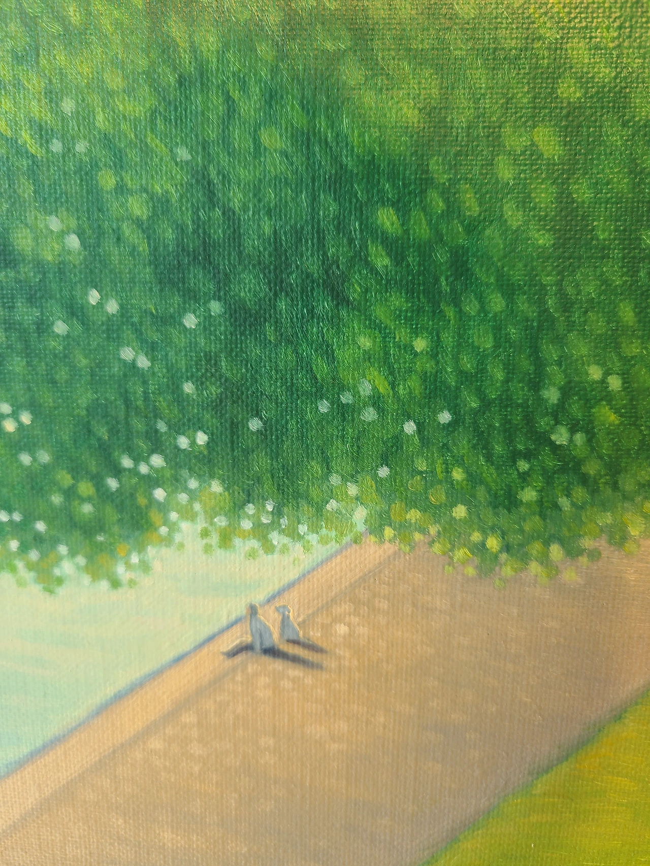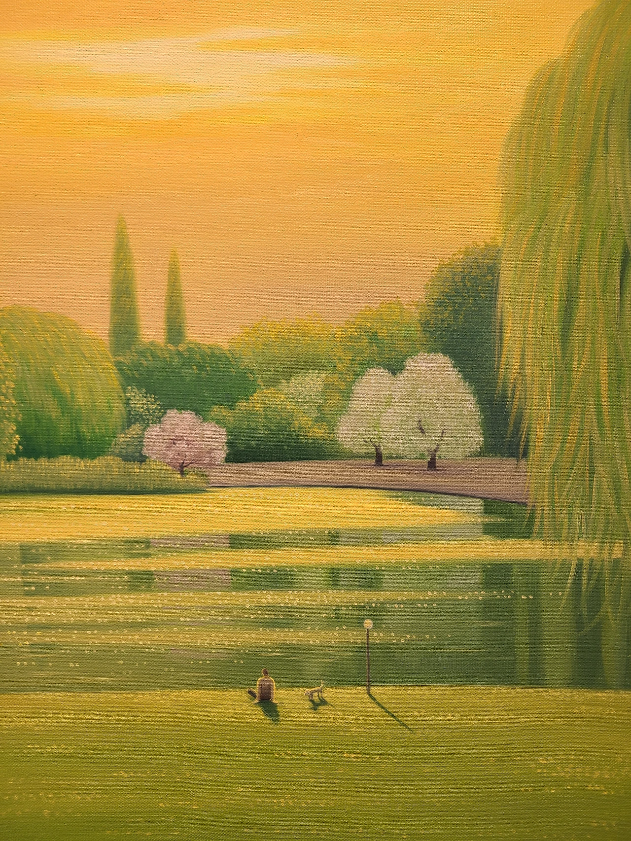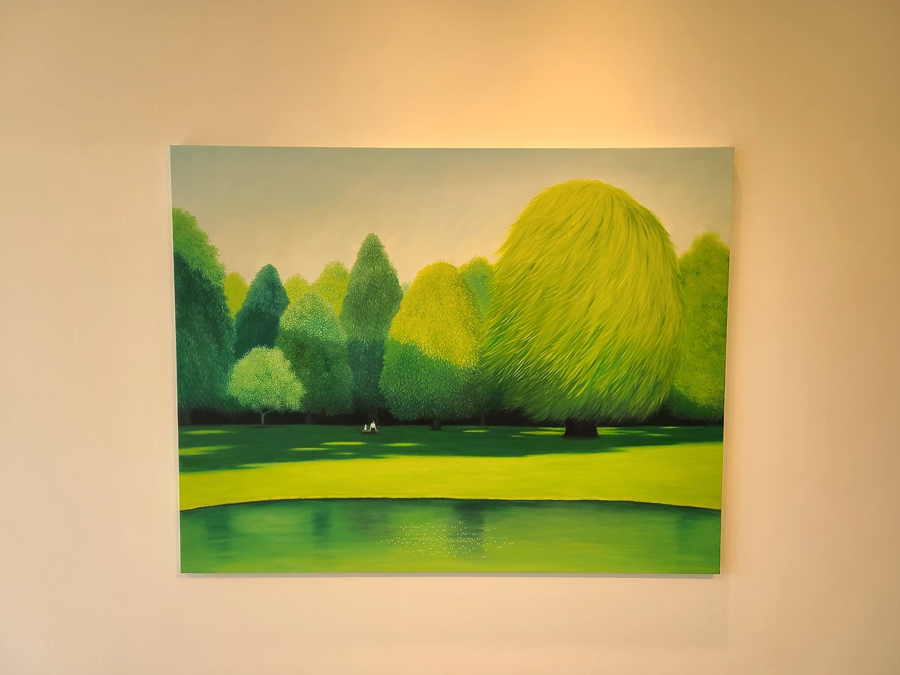 박지영 작가님은 본인 스스로 말씀하시길, "내가 추구하는 작업들은 어떻게 보면 너무나 평범한 풍경화에 지나지 않는다."라고 하셨고, 그림 속에 나오는 푸른 나무, 호수와 바다, 고요한 풍경과 같은 소재들은 그저 자연스럽게 그리는 것들이고 뚜렷한 의미가 있거나 상징하는 것이 있는 그림도 아니라고 합니다.