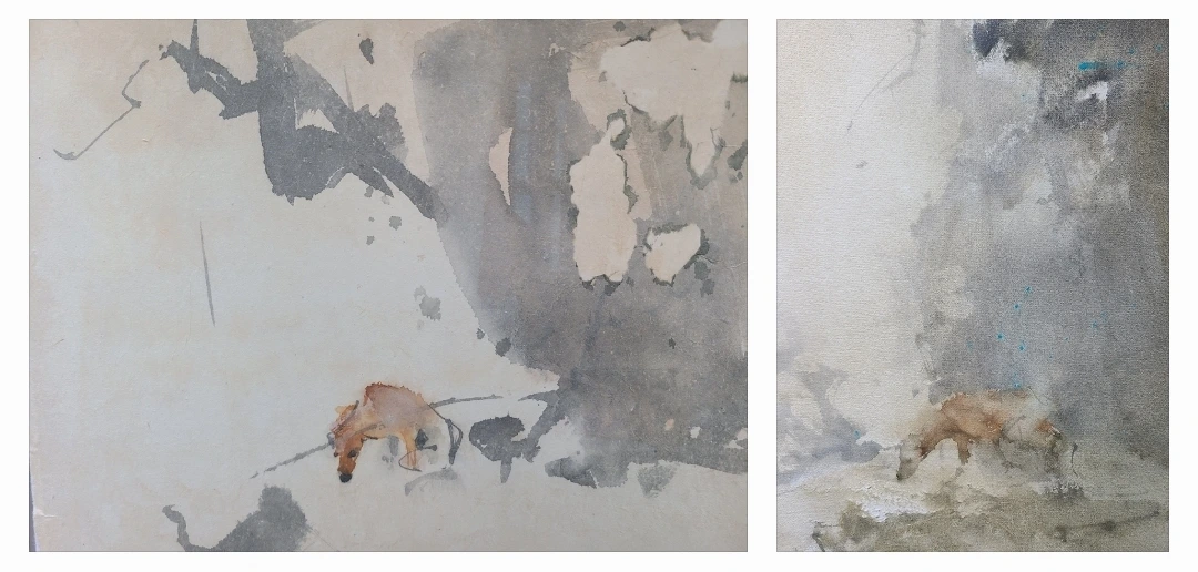 작가는 자기 표현력이 강한 작가로 대상에 자신의 감정을 이입하는 표현적인 그림을 시도하였습니다. 겁에 질린 듯 두려움에 싸인 들개의 모습과 붉은색 그림자를 통해 북한 탈주민으로서 자기 정체성을 투영했어요.
