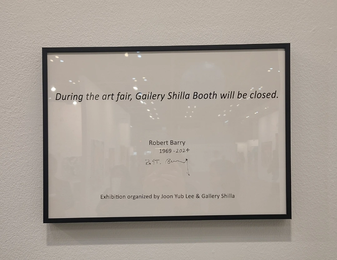 갤러리 신라는 지난 4월에 열렸던 아트오앤오 때처럼 부스가 닫혀 있었고 5월 31일에 열린 로버트 베리의 시그니처만 액자로 걸려있었죠. 로버트 배리는 1960년대에 개념미술을 시작한 작가로 평가받습니다. 작가의 목표는 '비시각에 기초한 시각예술' 예를 들면, 텔레파시, 전파 및 단어와 같은 미디어 같은 것들입니다. 눈에 보이지 않는 것들에 대한 예술이 모순적이고 말이 되지 않지만, 도전을 해서 성공했다는 평가를 받았습니다.
