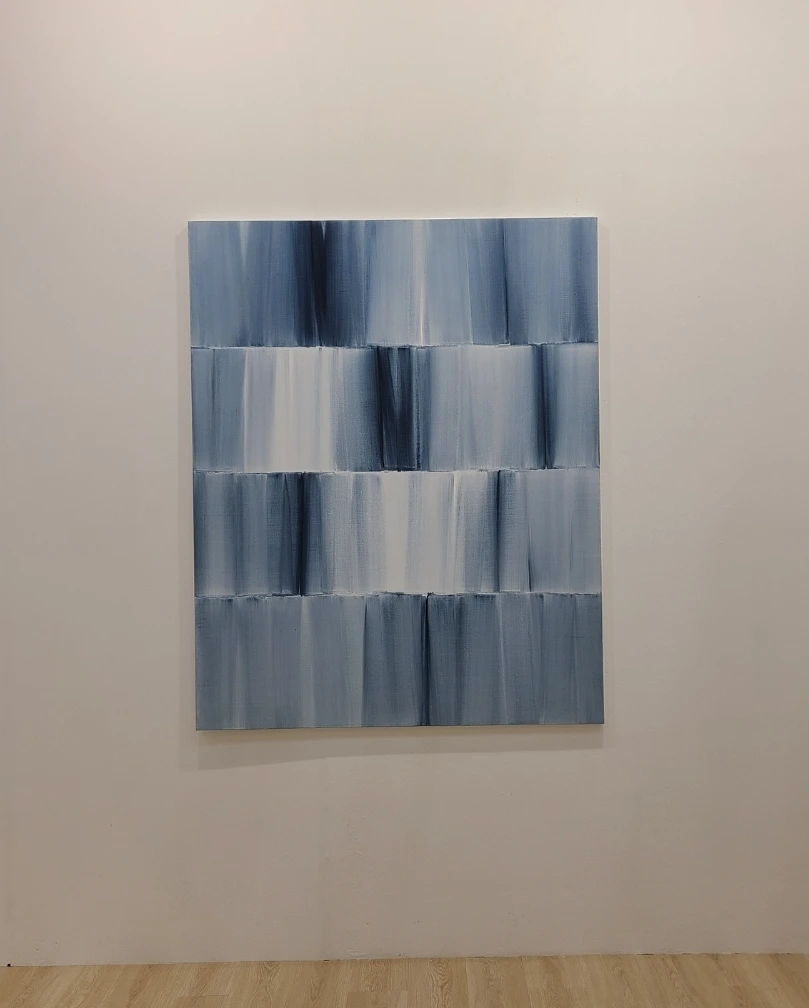 작가님의 작품은 대부분 단색화처럼 추상적 이미지로 표현되고 있지만, 유성물감을 칠한 바탕 위에 수성물감으로 붓질을 하는 것을 보면 고정된 틀을 벗어나려는 자유로움 마치 밀리고 밀려오는 파도처럼 연속성을 드러내고 있다는 점에서 단색화의 새로운 흐름을 볼 수 있다고 생각합니다.