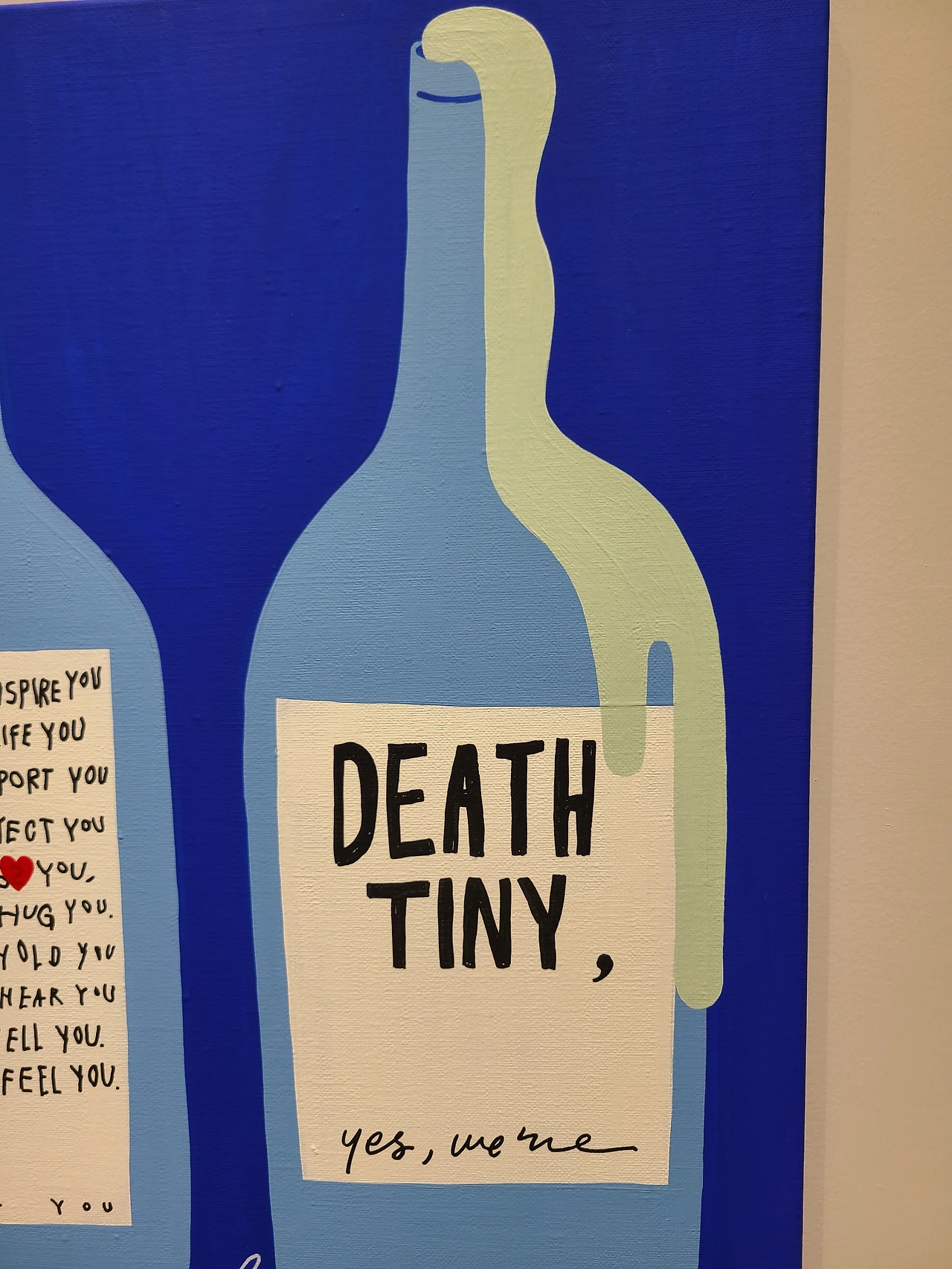 캘리박 작가님은 텍스트 위주의 작업이 많다 보니, 캔버스 작품에서 보이는 텍스트가 눈에 들어왔어요. Death tiny와 전시 타이틀에 적힌 <ho, me>을 보면 작가만의 신선한 아이디어와 유머러스함을 보면 확실히 다른 일상을 다룬 작품들과는 차별성이 느껴졌습니다.
