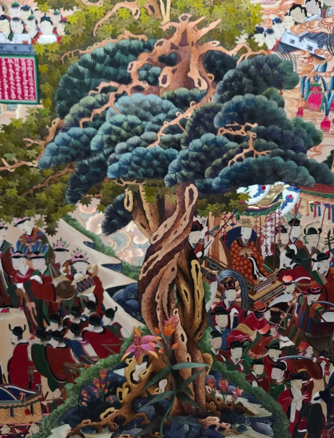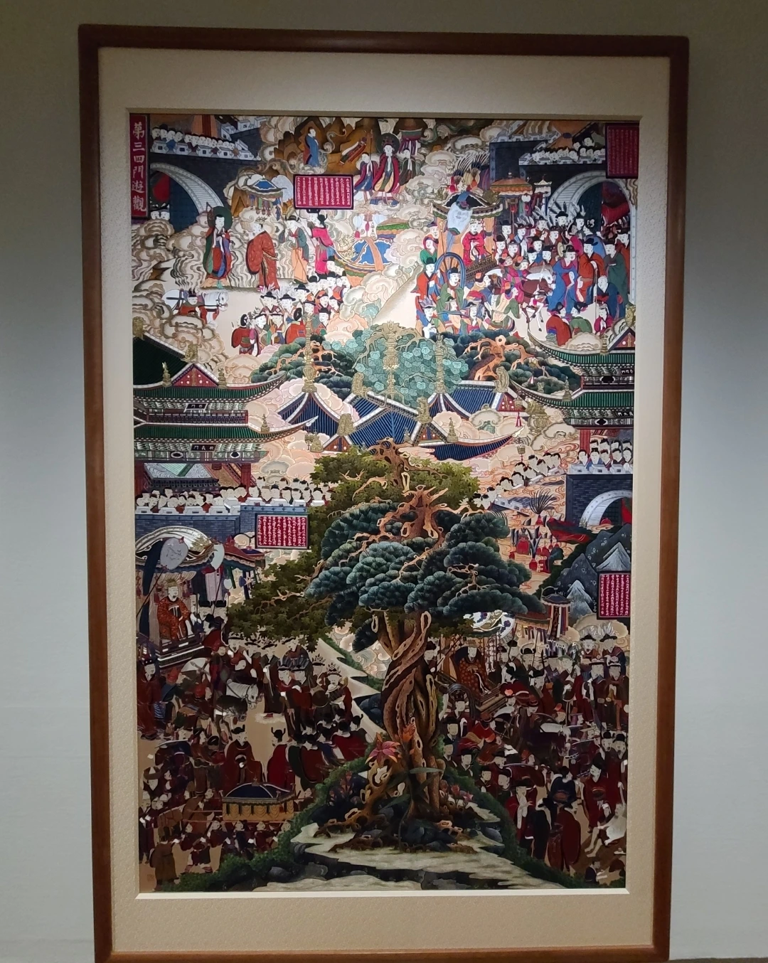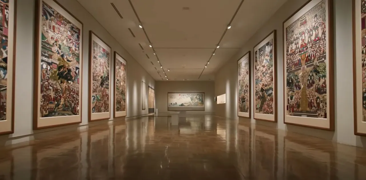대망의 피날레를 장식하는 작품은 가장 끝에 나오는 최유현 작가의 팔상도(八相圖)입니다. 불교적인 성격이 매우 짙은 작품들이죠. 매우 거대한 작품에 압도를 당하는 느낌이 들면서도 섬세하게 불교적인 성격을 표현한 것을 보면 정말 놀랍습니다. 전생의 부처가 도솔천에서 내려와 잉태해서 룸비니 동산에서 탄생하는 모습과 사문 밖을 나가 노인, 병자, 시체 그리고 고행자를 목격하는 모습을 아주 잘 묘사했고, 설산에서 수도하는 모습, 설법하는 모습 끝으로 사리쌍수 아래에서 열반에 드는 모습까지 석가모니의 삶이 그대로 느껴졌습니다.