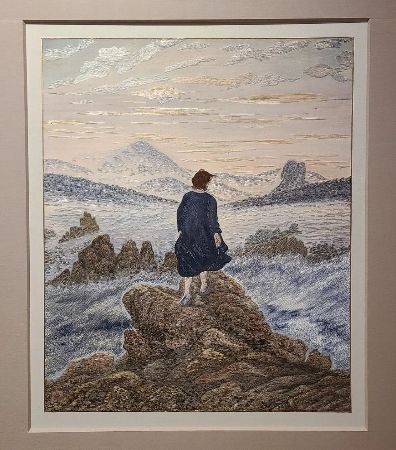 이 밖에도 제2대 국가 무역 문화재 자수장 최유현 작가님의 <태양을 잡으려는 새들>, 문교부 장관상을 수상했던 송정인 작가님의 <벽걸이> 그리고 작품 속 여인의 뒷모습이 19세기 독일의 낭만주의 미술의 대표작 '안개 속 방랑자'를 연상하게 만드는 이정봉 작가님의 <파도>가 전시되어 있습니다.