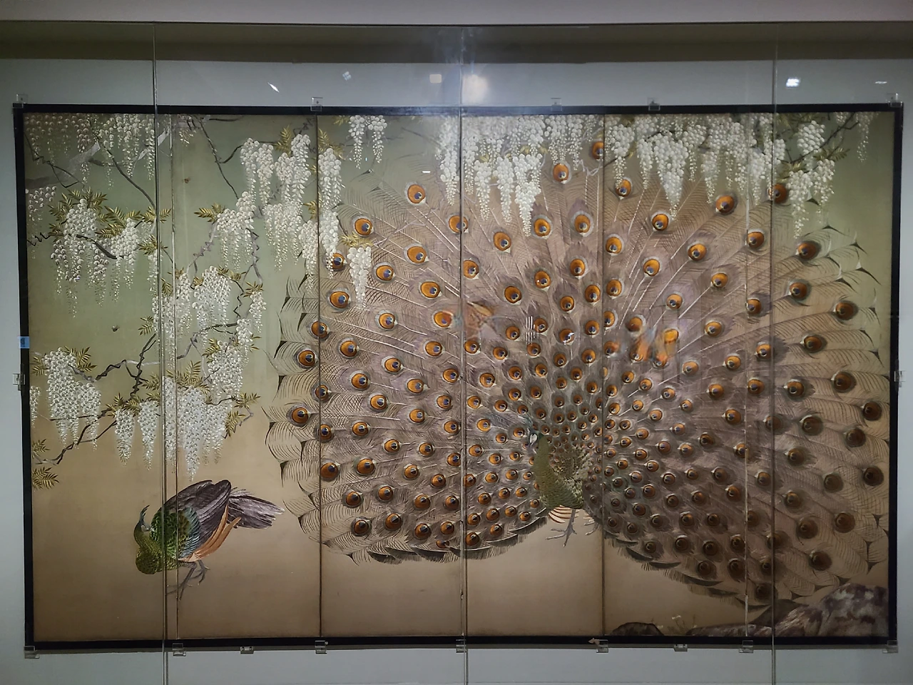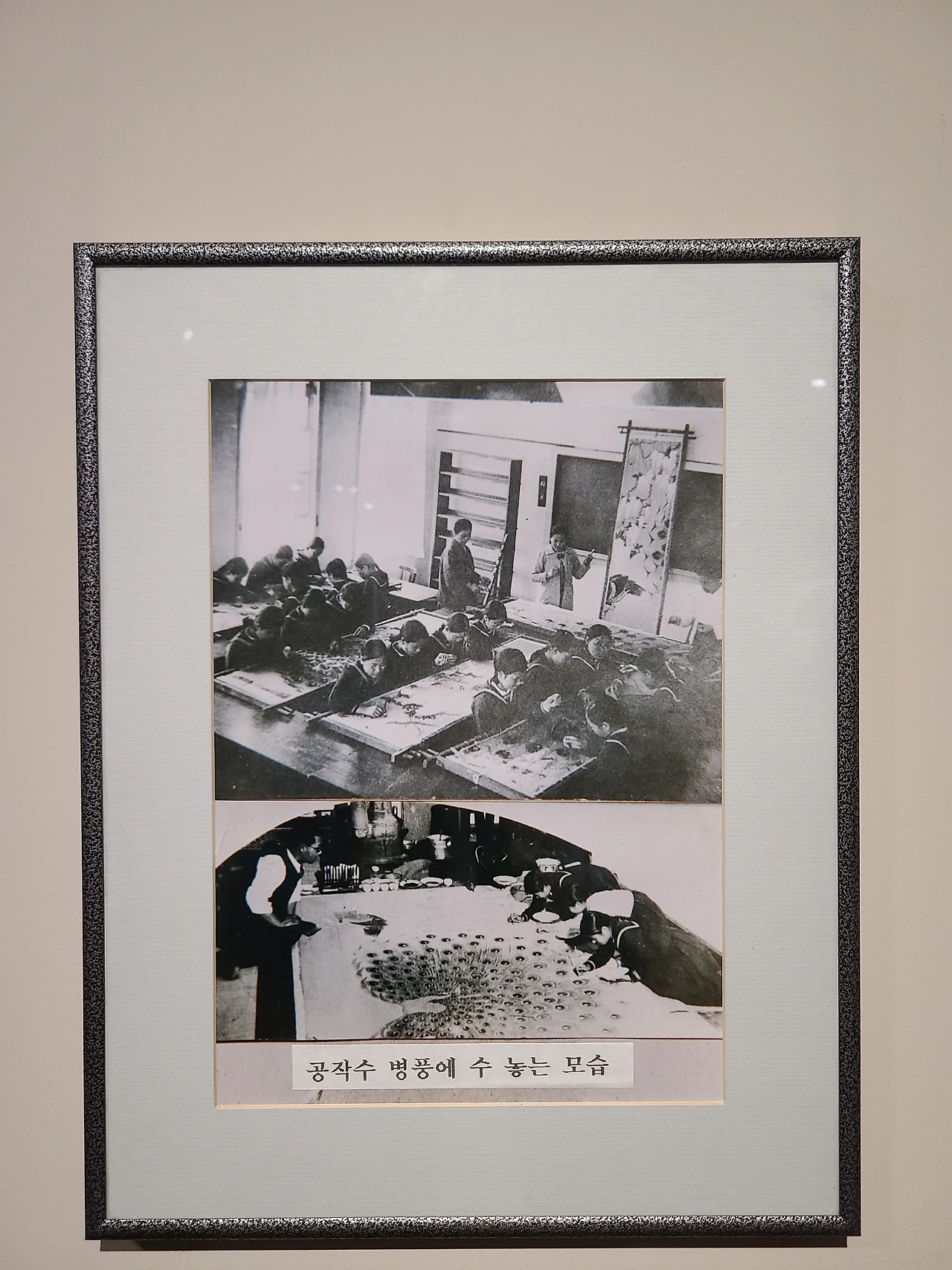 박을복, 이정봉 작가님의 작품들도 있지만, 기억에 남았던 작품을 꼽자면 숙명여고보생 공동제작으로 만들어진 '등꽃 아래 공작'이 기억에 남았습니다. 그 이유는 다른 작품들보다 화려해 보였어요. 광택 있는 풍사로 수놓아 부드러운 등나무 꽃잎과 공작의 화려한 꼬리깃털의 질감을 최대한 살렸고 실제 공작새를 보는 것처럼 사실적인 묘사를 가장 잘 표현했다는 생각이 들었습니다. 그 당시 학생들이 3년에 거쳐 완성한 작품인 만큼 고뇌와 인내가 고스란히 느껴졌습니다.