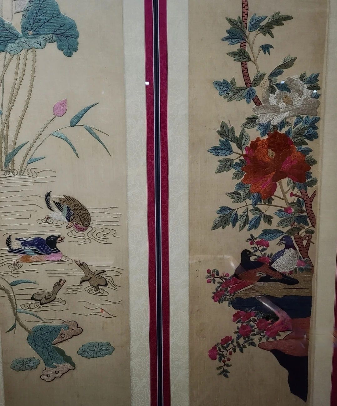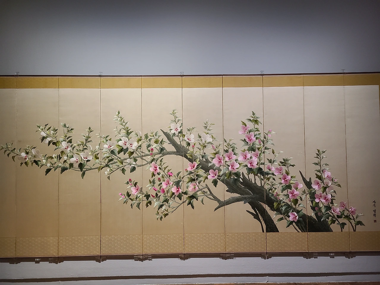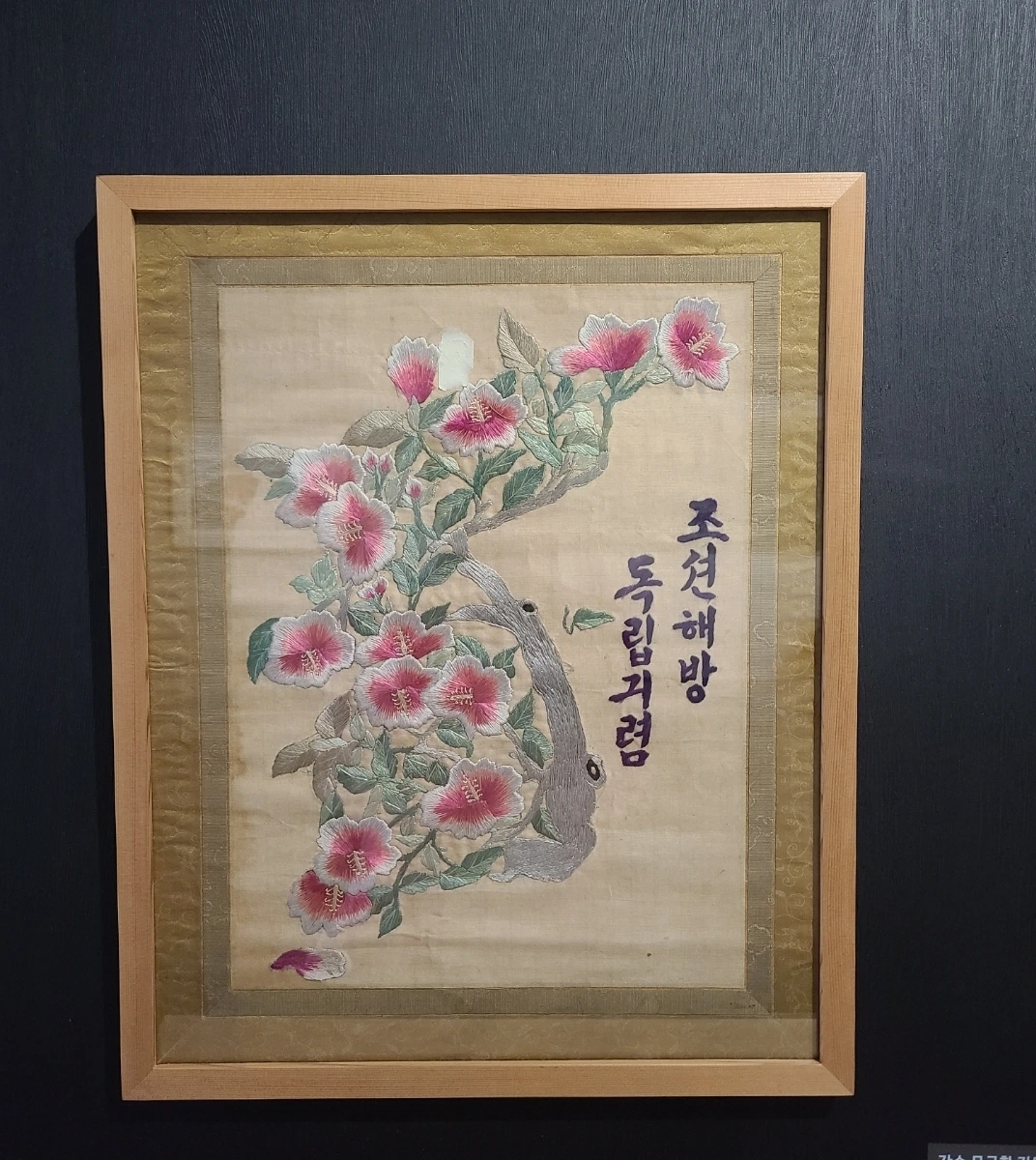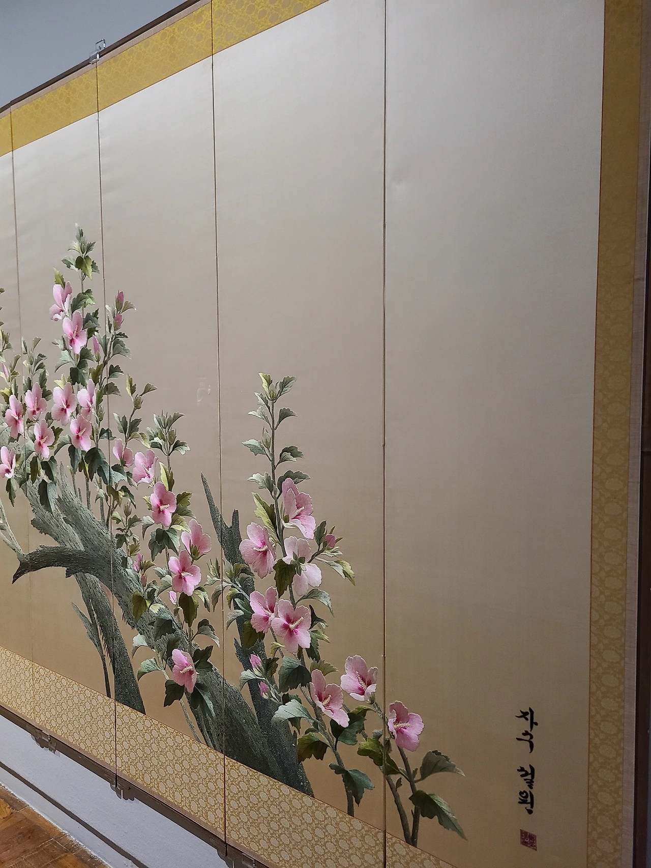 작품은 완성되기까지 3년이라는 시간이 걸렸습니다. 당시 청와대에서 구입했다고 합니다. 화려한 무궁화 가지를 수놓았어요. 무궁화는 오래 피는 꽃으로 우리나라를 상징합니다. 북한을 나타내는 우측에 붉은색 무궁화와 남한을 나타내는 흰색 무궁화가 한반도 형태로 곡선을 이룹니다. 각각의 꽃은 꼰실을 사용하였고 양감 있게 표현했습니다. 그리고 이 작품의 하이라이트는 동서양기법의 자수를 자유자재로 사용했다는 점입니다.