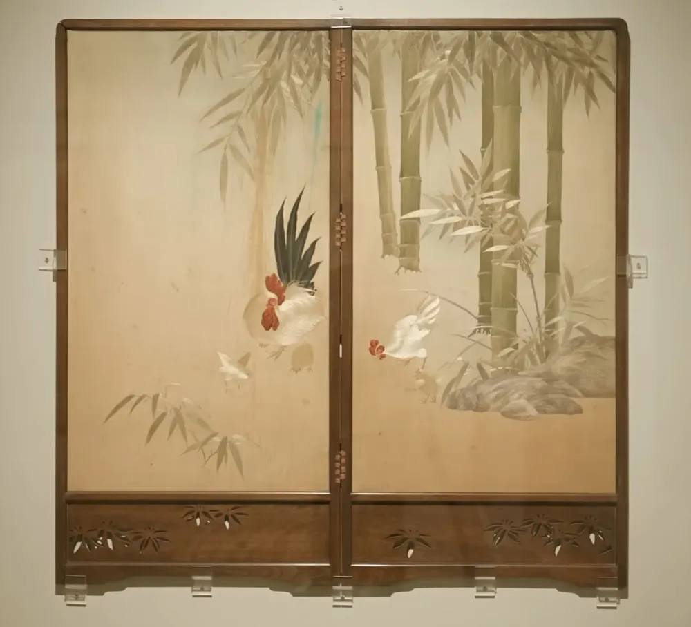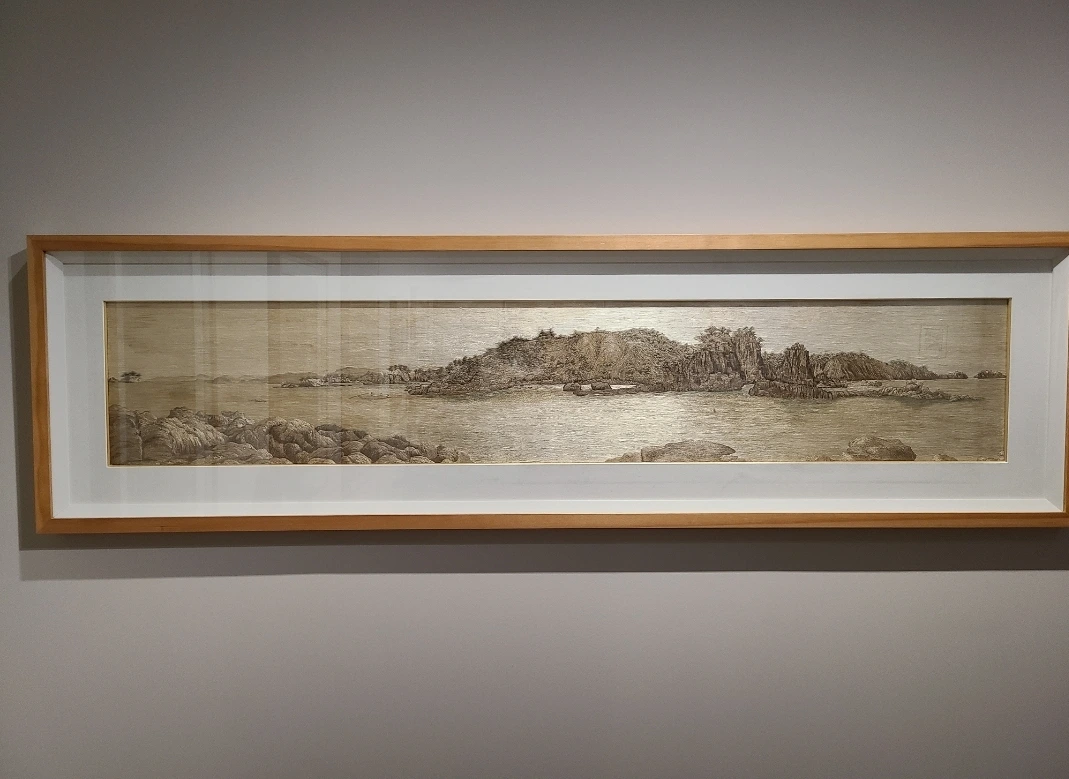 전시에는 우리나라 최초의 여성 서양화가인 나혜석의 조카 나사균 작가님의 졸업작품 1937년작 '죽계'를 볼 수 있습니다. 가족의 화목을 상징하는 원앙 대신 대나무 속의 닭을 자수로 새긴 정교한 솜씨가 전통자수보다 더 사실적이고 실을 꼬아 쓰는 전통자수와는 달리 가는 가는 실을 써서 윤택한 느낌이 강합니다. 방향에 따라 길고 짧은 실들을 써가면서 입체감을 잘 살리고 있는 솜씨가 돋보이는 작품입니다.