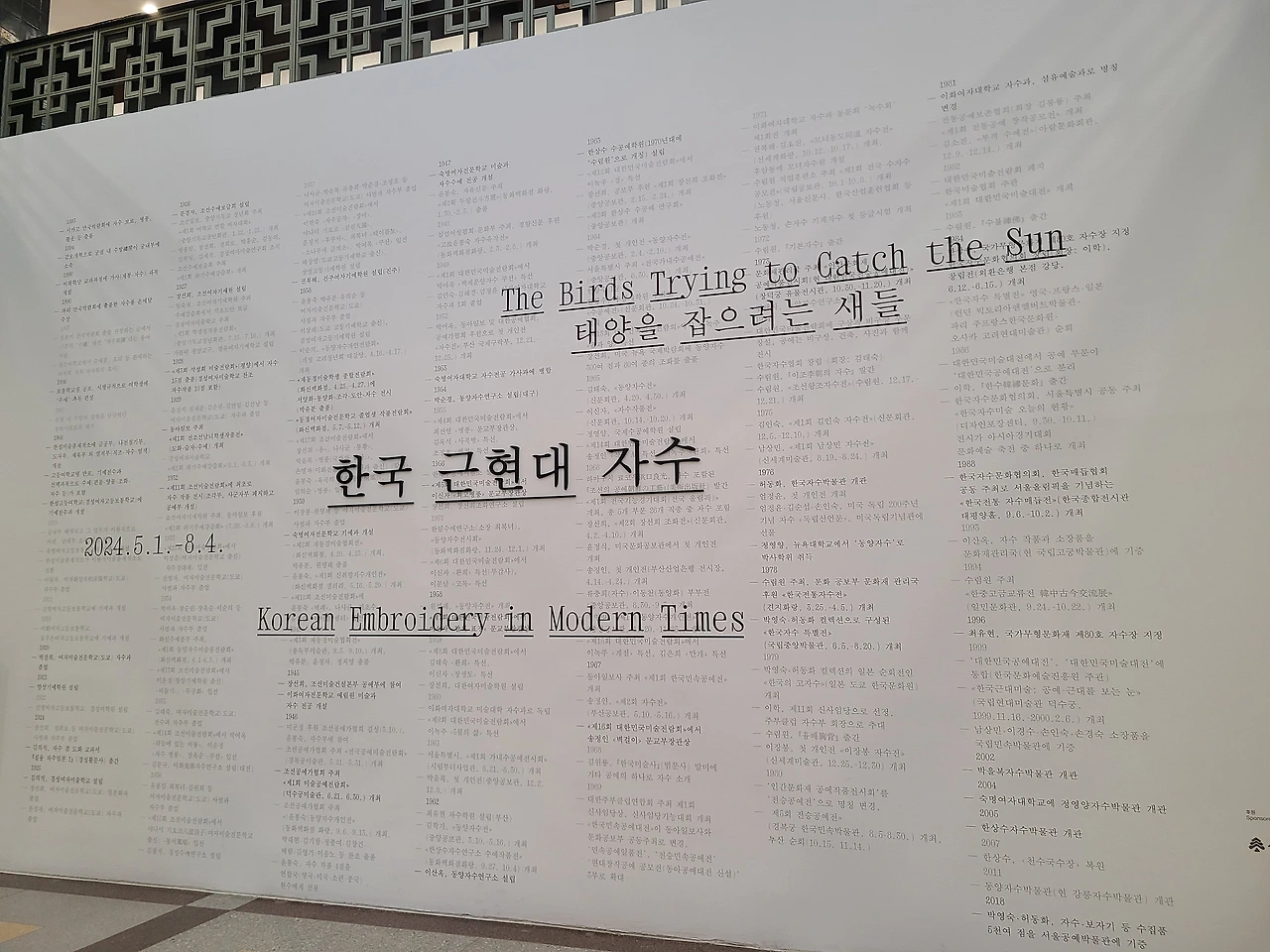 우리나라 자수 문화의 심미감과 정통성, 역사를 전부 다 볼 수 있는 전시회가 국립현대미술관 덕수궁에서 열렸습니다. 근대미술관으로서 특화된 역할을 수행하는 곳인 만큼 전시회의 타이틀도 <한국 근현대 자수: 태양을 잡으려는 새들>이라는 타이틀로 19세기말 이후로 제작된 자수 작품들이 나왔습니다. 국내외 60여 기관과 개인이 소장한 근현대 자수, 회화, 자수본 170여 점 그리고 아카이브 50여 점이 출품되었고 오는 8월 4일까지 개최합니다.