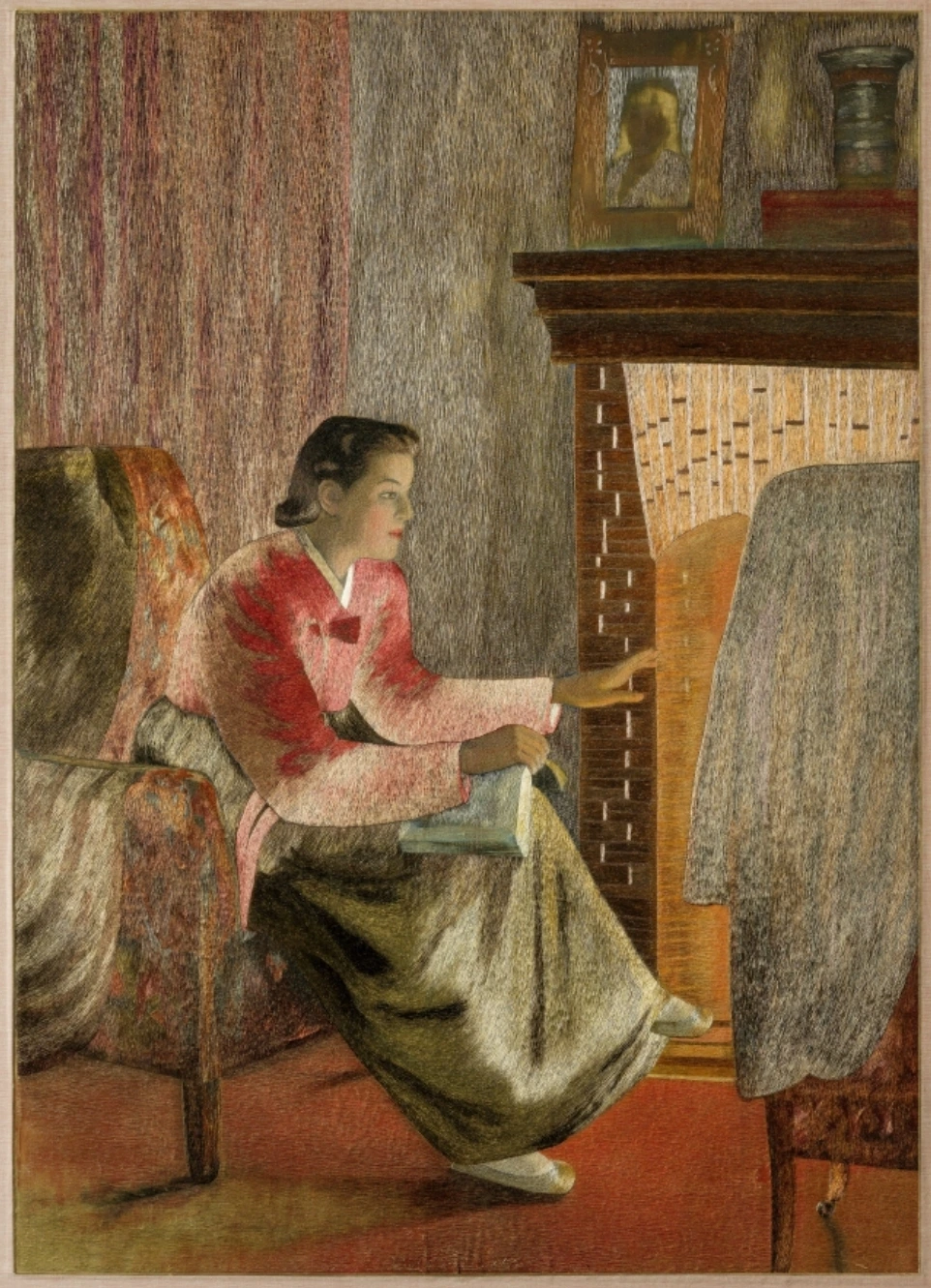 저에게 크게 와닿았던 부분은 한복, 소파 그리고 카펫의 촉감이 느껴질 정도였고, 난로의 온기가 느껴져 작품에서 따뜻함이 다가왔습니다. 그리고 신기했던 점은 보는 각도와 조명에 따라 색이 다르게 보여서 회화작품에서만 보이는 가변성을 지니고 있어요. 개인적으로 이 작품이 전통적인 기법에서 벗어나 만든 작품 중에서는 가장 사실적으로 표현한 작품이라고 여겨졌습니다.