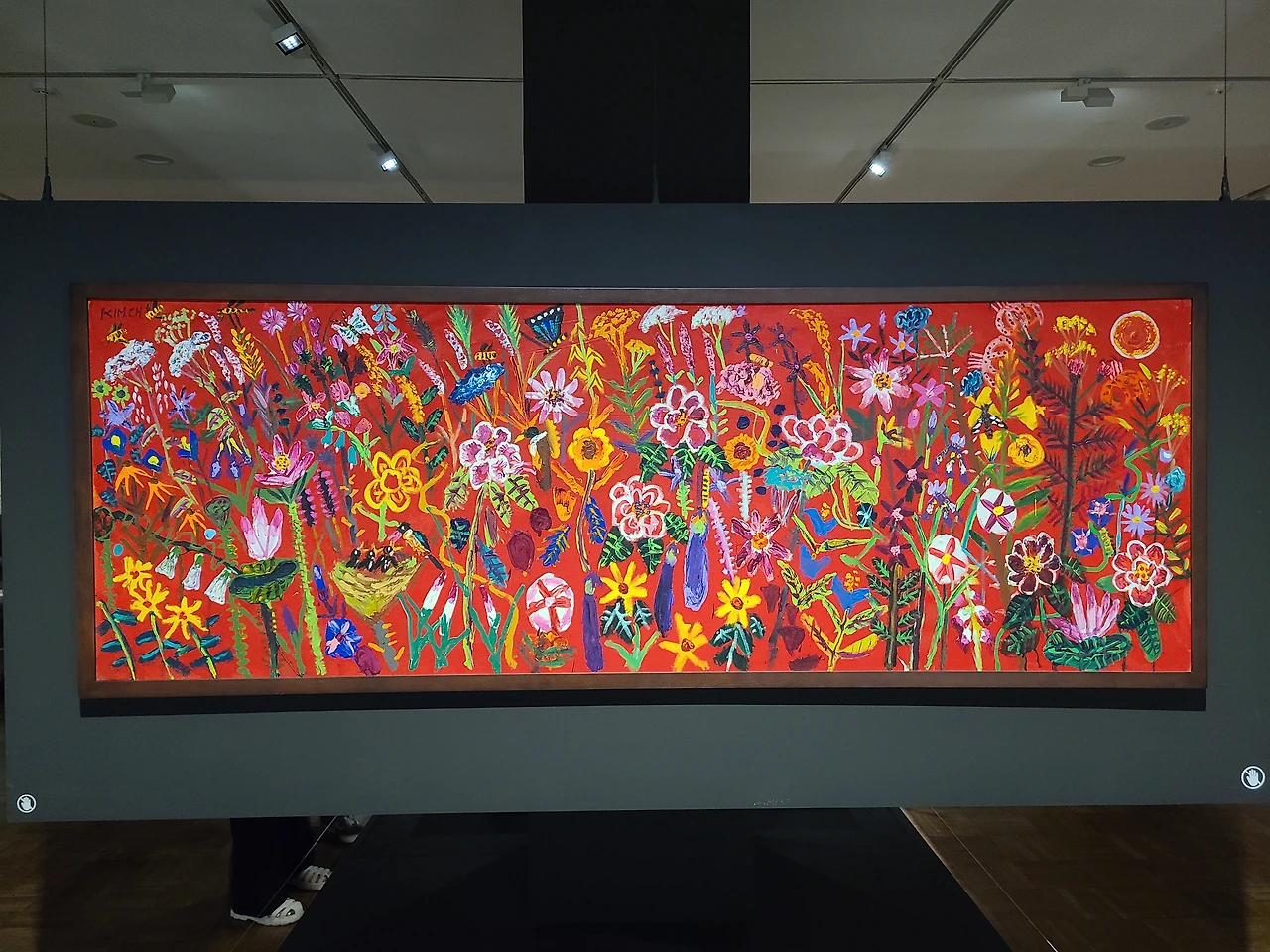 그리고 제1전시실에 들어서면 가장 먼저 보이는 회화작품이 있습니다. 작품 이름은 <백화만발>입니다. 자수전시에서 회화작품이 먼저 보이는 게 의외라고 생각했지만, '꽃의 화가'라고 불리는 김종학 작가님은 이 작품을 통해 전통 자수에서 큰 영감을 받아 생명력이 가득한 원색의 꽃과 과감한 형태의 생명체를 표현했습니다. 이 작품으로 하여금 자수와 회화는 아주 밀접한 관계가 있다는 것을 상징적으로 보여주고 있어서 의미 있는 작품이라 여겨집니다.