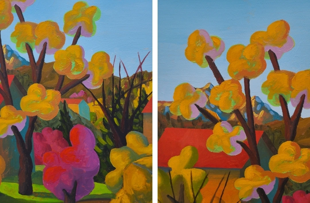 저에게 가을은 봄과는 반대로 그윽하고 시크한 느낌이지만, 살보의 작품에서는 이러한 느낌보다는 꿈속에서 가을을 따스하게 맞이한 느낌인데요. 왜냐하면 10월 풍경에서 볼 수 없는 밝은 핑크색, 노란색, 주황색, 초록색 등이 과감하게 사용되었다는 점이죠. 그래서 '작가님의 가을은 이런 느낌이구나.'라는 생각이 들었습니다. 만약에 가능하다면, 작가님의 작품 속에서 사랑하는 사람과 데이트를 하고 싶었어요. 10월의 풍경도 다른 작품들과 마친가지로 현실적인 기반을 가지고 있지만, 작가의 내면에서 나오는 색채와 형태로 인해 기억 속과 꿈속에서의 이미지로 재해석했습니다. 작가님의 기억 속에 10월은 어떤 의미였길래 이토록 아름다운 작품이 나왔는지 생각해 보게 되는 작품이었어요.